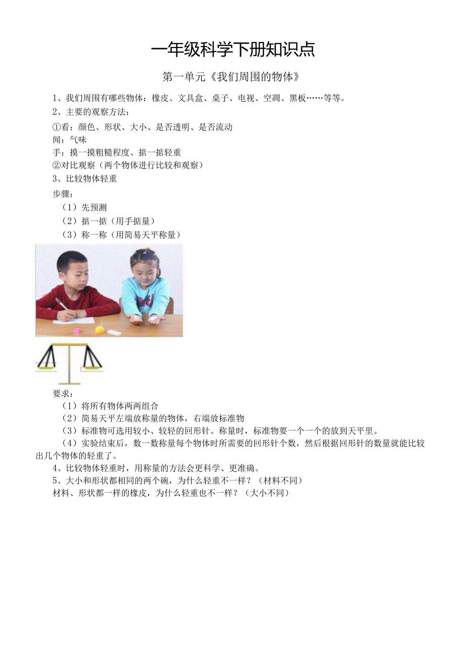 1、一年级科学下册知识点第一单元我们周围的物体1、我们周围有哪些物体:橡皮、文具盒、桌子、电视、空凋、黑板等等。2、主要的观察方法:看:颜色、形状、大小、是否透明、是否流动闻:气味手:摸一摸粗糙程度、掂一掂轻重对比观察(两个物体进行比较和观察)3、比较物体轻重步骤:(1)先预测(2)掂一掂(用手掂量)(3)称一称(用简易天平称量)要求:(1)将所有物体两两组合(2)简易天平左端放称量的物体,右端放标准物(3)标准物可选用较小、较轻的回形针。称量时,标准物要一个一个的放到天平里。(4)实验结束后,数一数称量每个物体时所需要的回形针个数,然后根据回形针的数量就能比较出几个物体的轻重了。4、比较物体轻重