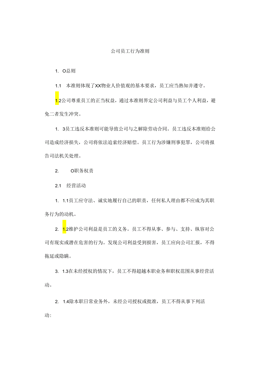 1、公司员工行为准则1. O总则1.1 本准则体现了XX物业人价值观的基本要求,员工应当熟知并遵守。1.2公司尊重员工的正当权益,通过本准则界定公司利益与员工个人利益,避免二者发生冲突。1. 3员工违反本准则可能导致公司与之解除劳动合同。员工违反本准则给公司造成经济损失,公司将依法追索经济赔偿。员工行为涉嫌刑事犯罪,公司将报告司法机关处理。2. O职务权责2.1 经营活动1. 1.1员工应守法、诚实地履行自己的职责,任何私人理由都不应成为其职务行为的动机。2. 1.2维护公司利益是员工的义务。员工不得从事、参与、支持、纵容对公司有现实或潜在危害的行为。发现公司利益受到损害,员工应向公司汇报,不得拖