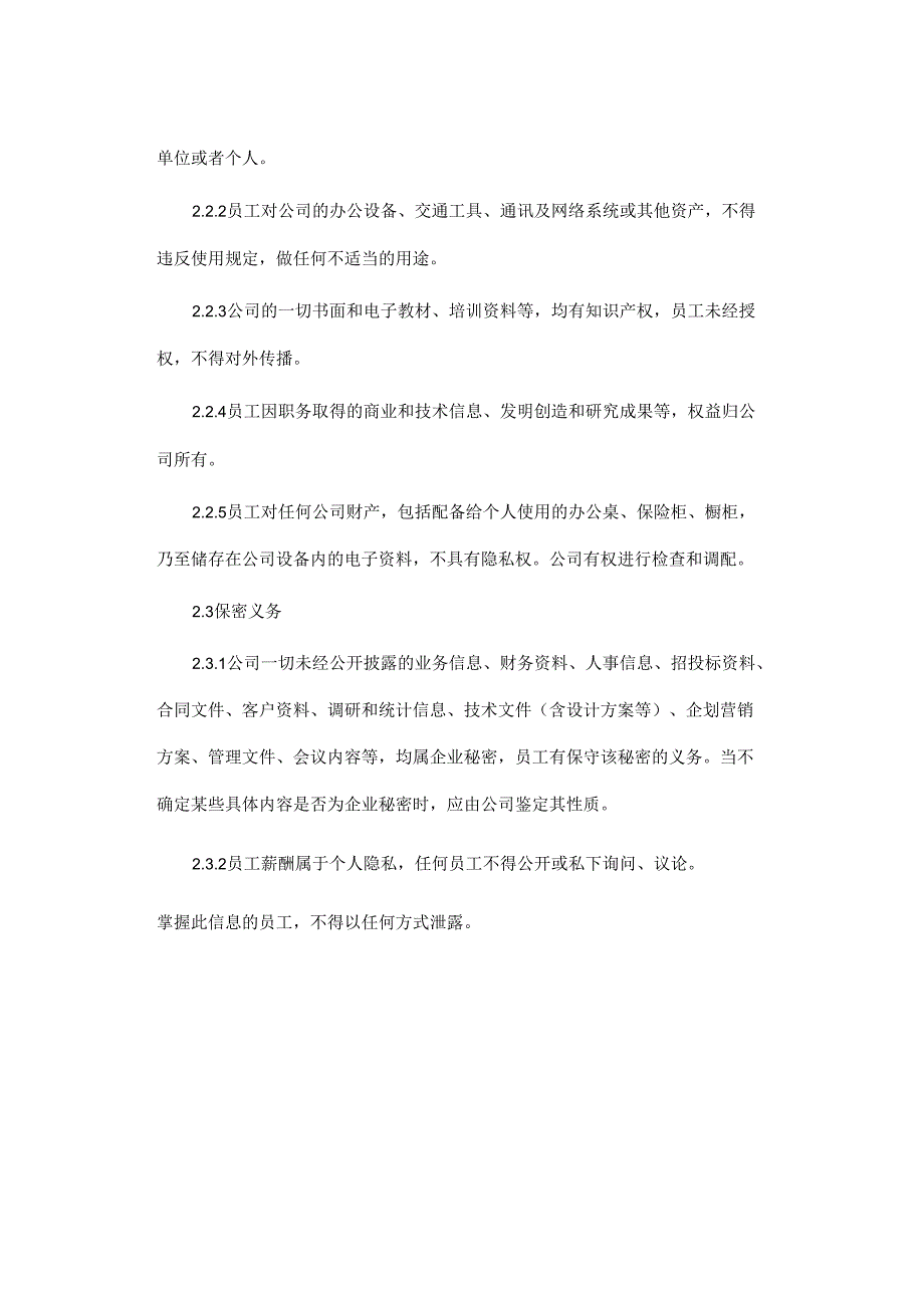 4、违反使用规定,做任何不适当的用途。2.2.3公司的一切书面和电子教材、培训资料等,均有知识产权,员工未经授权,不得对外传播。2.2.4员工因职务取得的商业和技术信息、发明创造和研究成果等,权益归公司所有。2.2.5员工对任何公司财产,包括配备给个人使用的办公桌、保险柜、橱柜,乃至储存在公司设备内的电子资料,不具有隐私权。公司有权进行检查和调配。2.3保密义务2.3.1公司一切未经公开披露的业务信息、财务资料、人事信息、招投标资料、合同文件、客户资料、调研和统计信息、技术文件(含设计方案等)、企划营销方案、管理文件、会议内容等,均属企业秘密,员工有保守该秘密的义务。当不确定某些具体内容是否为企业