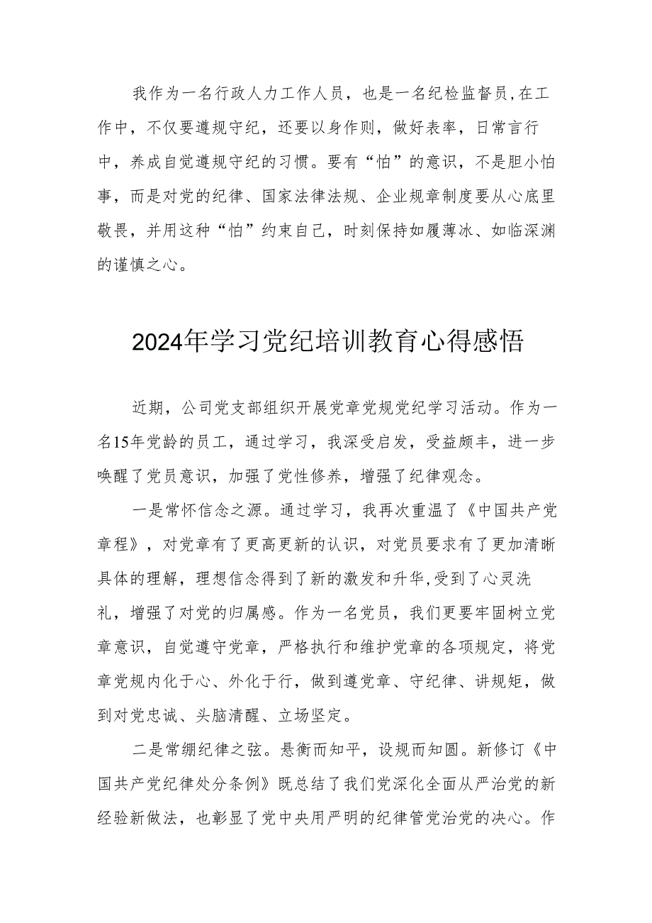 2、,始终做到自重、自省、自尊、自励。时刻提醒自己心中有戒尺、头顶有利剑、耳旁有警钟,努力增强是非面前的辨别能力、诱惑面前的自控能力、警示面前的醒悟能力,以更高的标准、更严的要求,以身作则,以上率下。作为一名行政人事工作人员,在工作上,我会继续高标准、严要求,加强自我管理,严格执行公司规章制度,严格履职尽责,严格内控制度落实,为营造风清气正的干事创业氛围做出自己的贡献。2024年学习党纪培训教育心得感悟习近平总书记曾强调:“要把严守纪律、严明规矩放到重要位置来抓,努力在全党营造守纪律、讲规矩的氛围。”这充分说明了党规党纪对于我们党和每个党员的极端重要性和严肃性。通过本次学习,加深了我对党规党纪的理