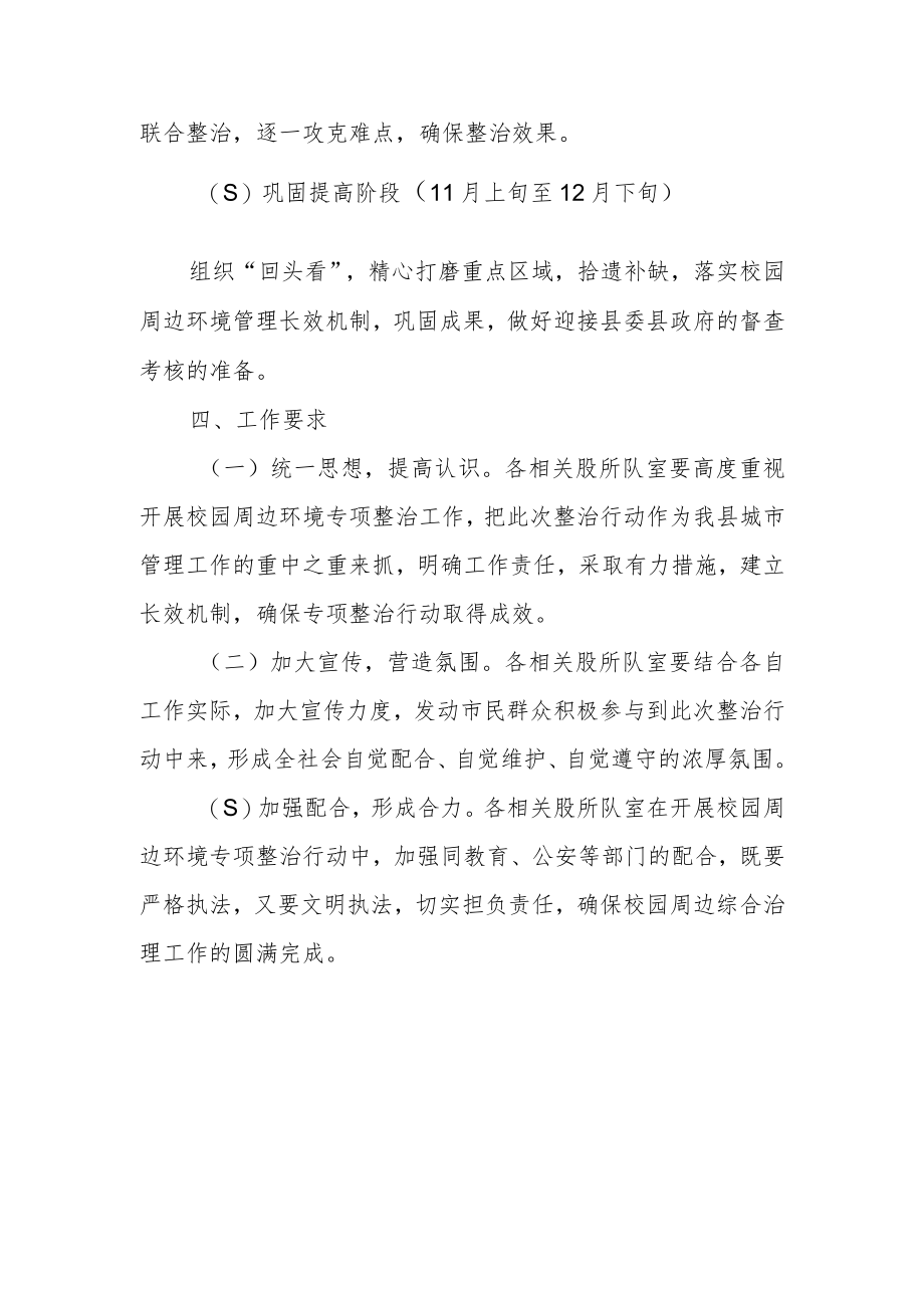 2、长:XX副组长:XX成员:XXoXX同志任校园周边综合整治专干,抓好城区校园周边综合整治工作,确保县城校园环境综合整治目标全面落实。工作步骤根据全县的校园周边环境综合整治工作安排,结合我局工作实际,进一步规范城区校园周边临街商户经营行为,积极开展清理取缔各类非法占道经营;整治校园周边随意散发及乱涂写小广告行为;严厉查处校园周边违法占用人行道乱停乱放行为;加大对校园周边道路清扫保洁力度,确保环境干净、整洁。本次集中整治时间为3月初至12月底,共分三个阶段。(一)动员部署阶段(3月初至3月中旬)为宣传教育、调查摸底阶段。要动员全体执法人员和协管员,统一认识、全力投入。向学校周边居民、商家、违法经营