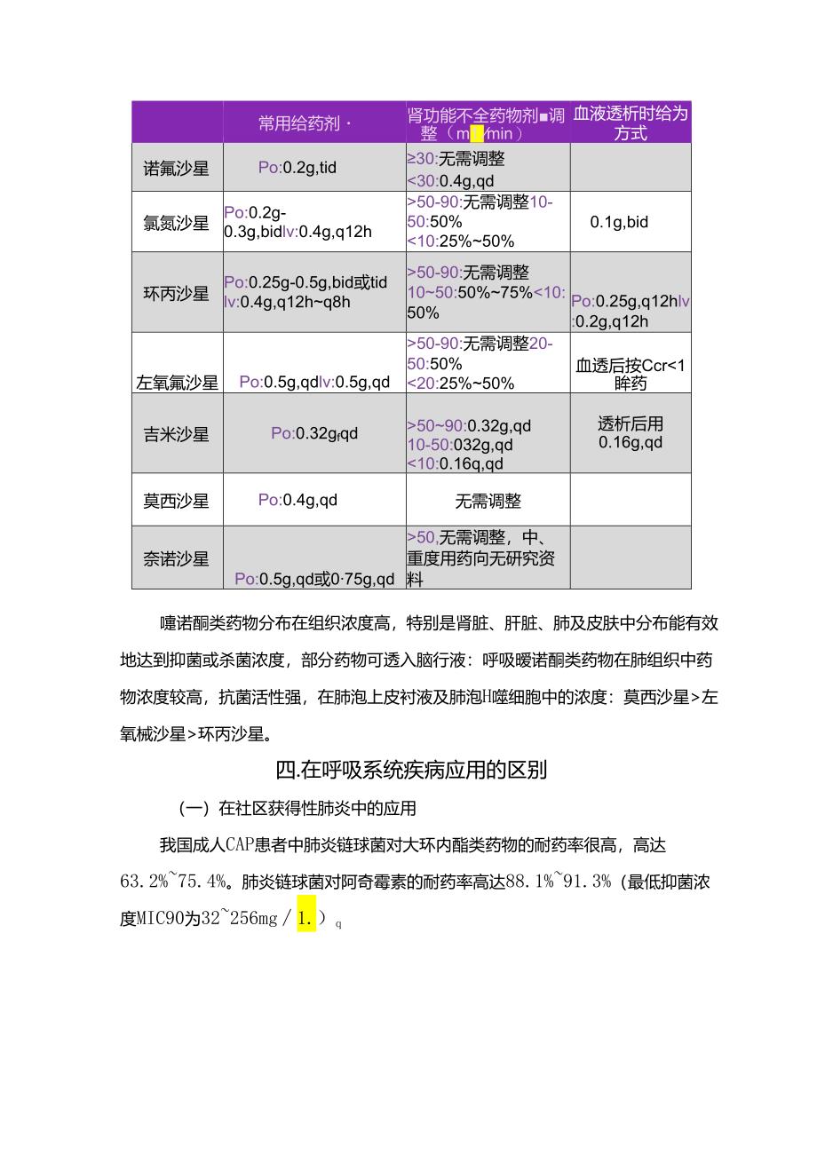 5、50%20:25%50%血透后按Ccr5090:0.32g,qd10-50:032g,qd50,无需调整,中、重度用药向无研究资料嚏诺酮类药物分布在组织浓度高,特别是肾脏、肝脏、肺及皮肤中分布能有效地达到抑菌或杀菌浓度,部分药物可透入脑行液:呼吸暧诺酮类药物在肺组织中药物浓度较高,抗菌活性强,在肺泡上皮衬液及肺泡H噬细胞中的浓度:莫西沙星左氧械沙星环丙沙星。四.在呼吸系统疾病应用的区别(一)在社区获得性肺炎中的应用我国成人CAP患者中肺炎链球菌对大环内酯类药物的耐药率很高,高达63.2%75.4%。肺炎链球菌对阿奇霉素的耐药率高达88.1%91.3%(最低抑菌浓度MIC90为32256mg1.