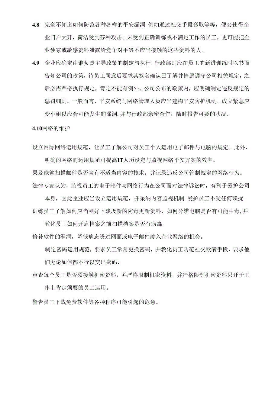 1、1O目的为r防止信息系统平安,满足C-TPAT的相关要求.2.0范Bl涉及的电脑设备.3.0职费:3. 1由专业人员负责全部电脑的检测和清理工作。3.2 由专业人员,依据上述作业安排进行检测。3.3 由经理负货对防范措施的落实状况进行监督.4.0程序1.1 信息系统平安管理的要求:一般工作部担心装软驱和光骅,如有安装软驱和光驱的电脑,每次运用破盘都要用杀毒软件检查。对于联网的计算器,任何人在未经批准的状况下,不得向计算器内将入软件或文榴.数据的备份由相关部门负贵人管理是,备份用的软盘由部门负责人供应。软盘光盘等在运用前,必需确保无病毒。计算器一经发觉病毒,应马上通知电购专业人员处理。操作员在离