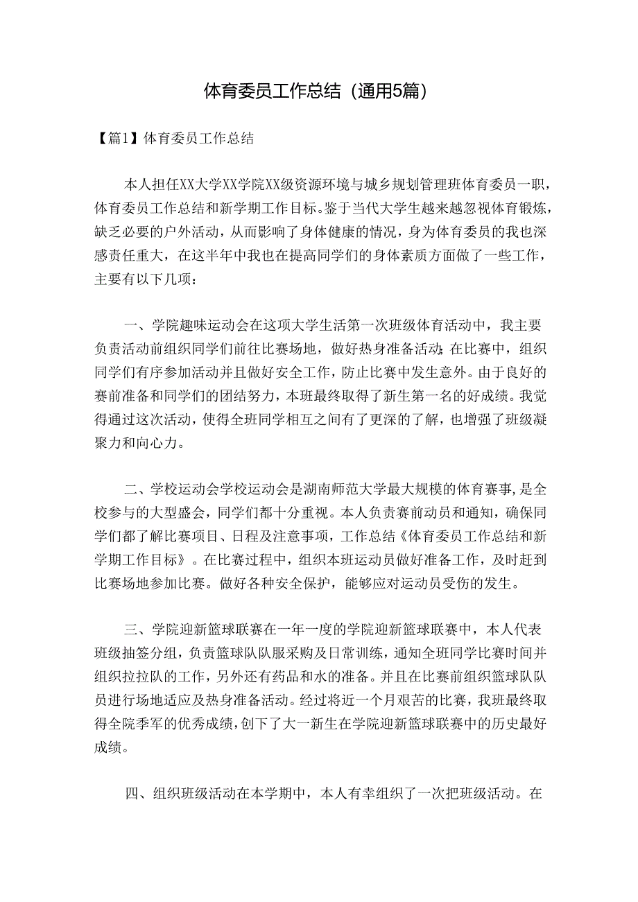 1、体育委员工作总结(通用5篇)【篇1】体育委员工作总结本人担任XX大学XX学院XX级资源环境与城乡规划管理班体育委员一职,体育委员工作总结和新学期工作目标。鉴于当代大学生越来越忽视体育锻炼,缺乏必要的户外活动,从而影响了身体健康的情况,身为体育委员的我也深感责任重大,在这半年中我也在提高同学们的身体素质方面做了一些工作,主要有以下几项:一、学院趣味运动会在这项大学生活第一次班级体育活动中,我主要负责活动前组织同学们前往比赛场地,做好热身准备活动;在比赛中,组织同学们有序参加活动并且做好安全工作,防止比赛中发生意外。由于良好的赛前准备和同学们的团结努力,本班最终取得了新生第一名的好成绩。我觉得通过