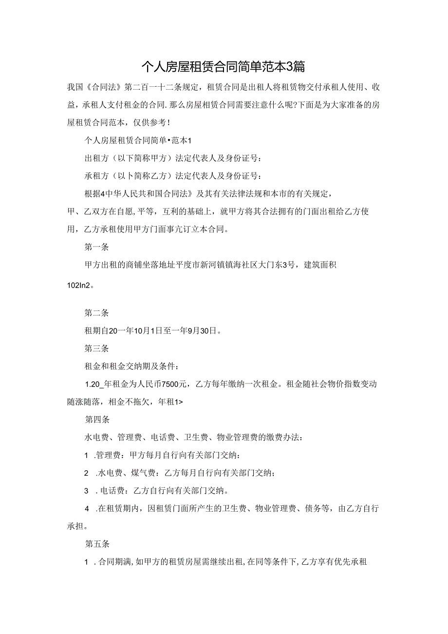 1、个人房屋租赁合同简单范本3篇我国合同法第二百一十二条规定,租赁合同是出租人将租赁物交付承租人使用、收益,承租人支付租金的合同.那么房屋相赁合同需要注意什么呢?下面是为大家准备的房屋租赁合同范本,仅供参考!个人房屋租赁合同简单范本1出租方(以下简称甲方)法定代表人及身份证号:承租方(以卜简称乙方)法定代表人及身份证号:根据4中华人民共和国合同法及其有关法律法规和本市的有关规定,甲、乙双方在自愿,平等,互利的基础上,就甲方将其合法拥有的门面出租给乙方使用,乙方承租使用甲方门面事亢订立本合同。第一条甲方出租的商铺坐落地址平度市新河镇镇海社区大门东3号,建筑面积102In2。第二条租期自20一年10月