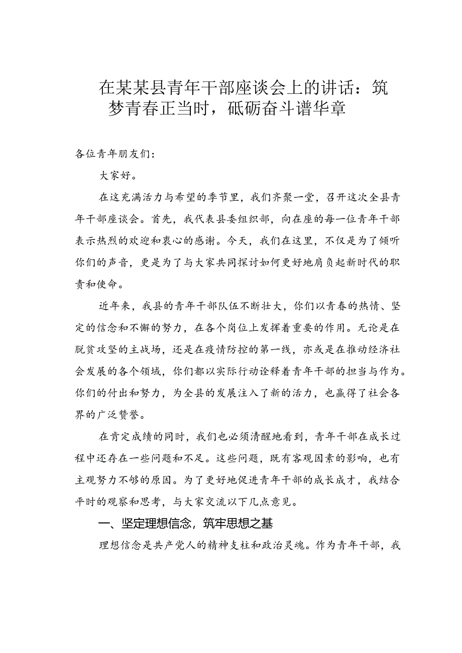 在某某县青年干部座谈会上的讲话:筑梦青春正当时砥砺奋斗谱华章.docx