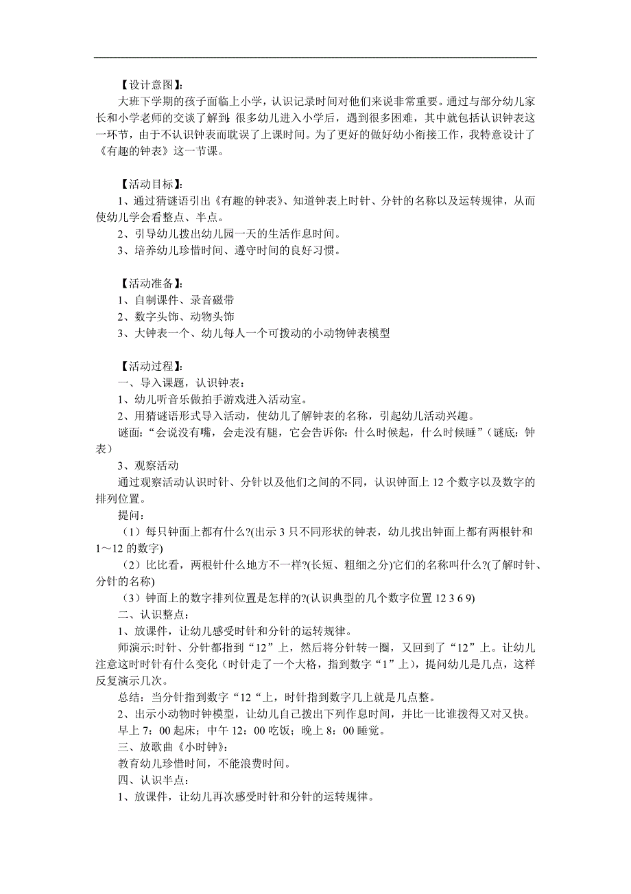 1、【设计意图】:大班下学期的孩子面临上小学,认识记录时间对他们来说非常重要。通过与部分幼儿家长和小学老师的交谈了解到:很多幼儿进入小学后,遇到很多困难,其中就包括认识钟表这一环节,由于不认识钟表而耽误了上课时间。为了更好的做好幼小衔接工作,我特意设计了有趣的钟表这一节课。【活动目标】:1、通过猜谜语引出有趣的钟表、知道钟表上时针、分针的名称以及运转规律,从而使幼儿学会看整点、半点。2、引导幼儿拨出幼儿园一天的生活作息时间。3、培养幼儿珍惜时间、遵守时间的良好习惯。【活动准备】:1、自制课件、录音磁带2、数字头饰、动物头饰3、大钟表一个、幼儿每人一个可拨动的小动物钟表模型【活动过程】:一、导入课题
