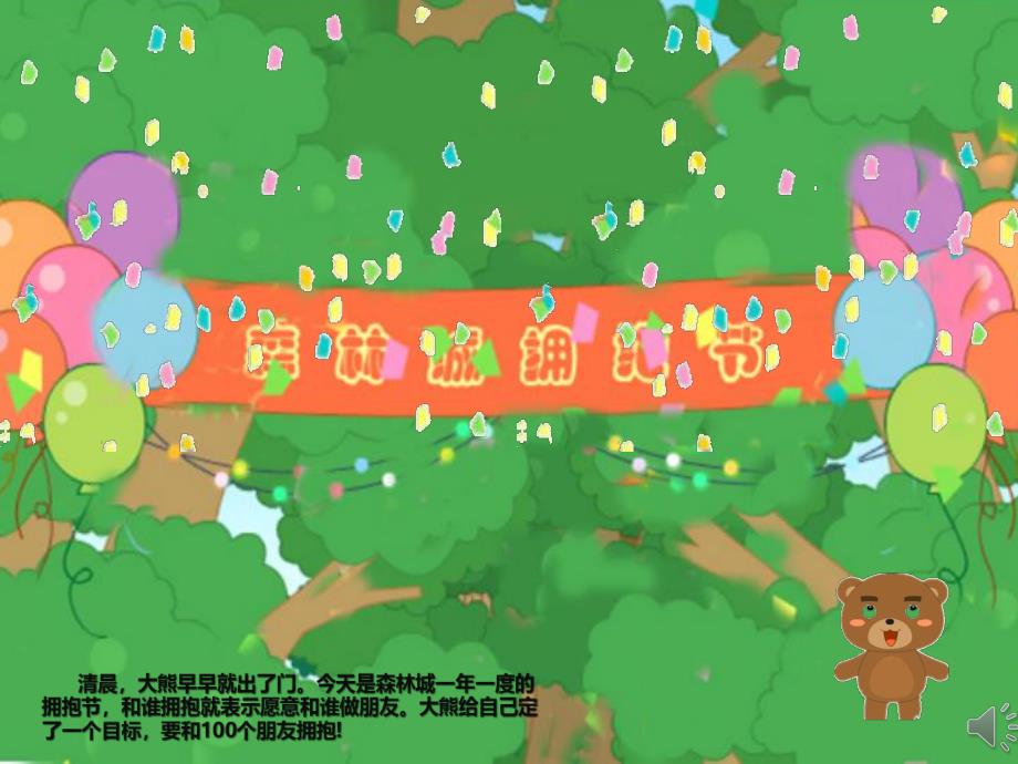 2、跟他拥抱。天快黑了,大熊没有拥抱到一个朋友。“昨天,我把兔妹妹的萝卜全拔光了。我还老是揪袋鼠哥哥和红狐狸的尾巴。”大熊的眼泪一滴一滴落下来。这时,小动物们手牵着手走过来,看见孤零零的大熊,他们都愣住了。大熊呢,马上站起来,捂着脸跑回家了。“我今天没拥抱大熊。”兔妹妹说。“大熊看上去很伤心呢!”袋鼠说。小动物们你看看我,我看看你,然后,他们都往大熊家走去。天黑了,大熊晚饭也没吃,一个人躺在床上想心事。笃笃笃!是谁在敲门?大熊慢吞吞地走过去开门。门一开,大熊惊呆了!小动物们在门前排成了长长的队伍,一个个张开双臂,说:大熊,祝你拥抱节快乐!我愿意做你的朋友。”大家一个接一个地拥抱了大熊,大熊的眼泪越来越多,比刚才没人拥抱他时还要多。他在心里暗暗对自己说,从明天起一定要让大家看到一个不一样的大熊!月亮的银光柔柔地洒在森林城,洒在互相拥抱着的小动物们身上,这真是一个令人难忘的拥抱节呀!大熊的拥抱节小朋友们,当大熊无意伤害了朋友时,一个拥抱就化解了大熊与小动物之间的矛盾,获得小动物的原谅。小朋友们我们生活中同样有像大熊一样的小朋友,我们说过做错了事情没有关系只要改正错误,那么作为朋友的我们是不是就应该原谅他呢!