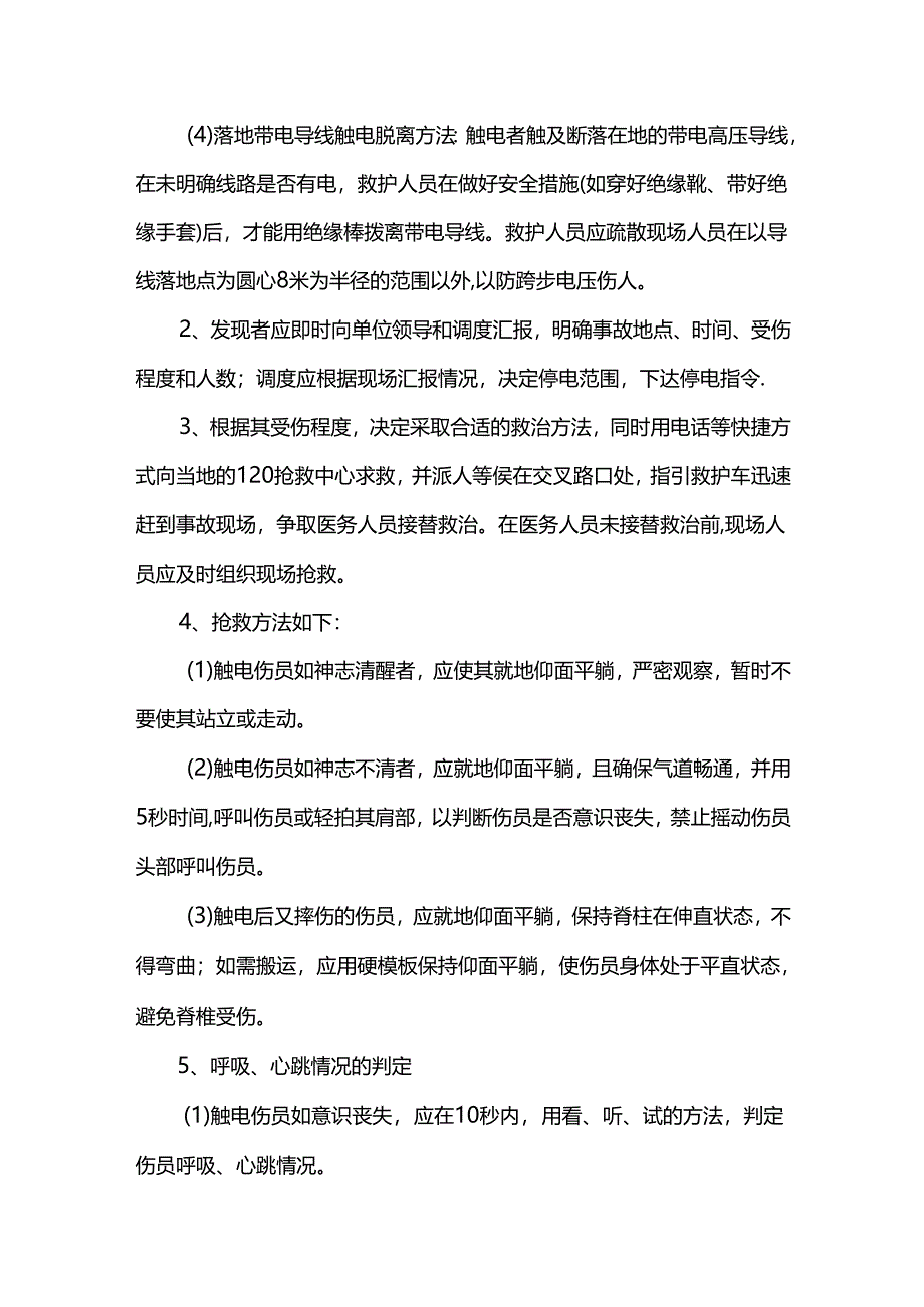 3、而再次伤害的,要迅速采取地面拉网、垫软物等预防措施。(4)落地带电导线触电脱离方法:触电者触及断落在地的带电高压导线,在未明确线路是否有电,救护人员在做好安全措施(如穿好绝缘靴、带好绝缘手套)后,才能用绝缘棒拨离带电导线。救护人员应疏散现场人员在以导线落地点为圆心8米为半径的范围以外,以防跨步电压伤人。2、发现者应即时向单位领导和调度汇报,明确事故地点、时间、受伤程度和人数;调度应根据现场汇报情况,决定停电范围,下达停电指令.3、根据其受伤程度,决定采取合适的救治方法,同时用电话等快捷方式向当地的120抢救中心求救,并派人等侯在交叉路口处,指引救护车迅速赶到事故现场,争取医务人员接替救治。在医