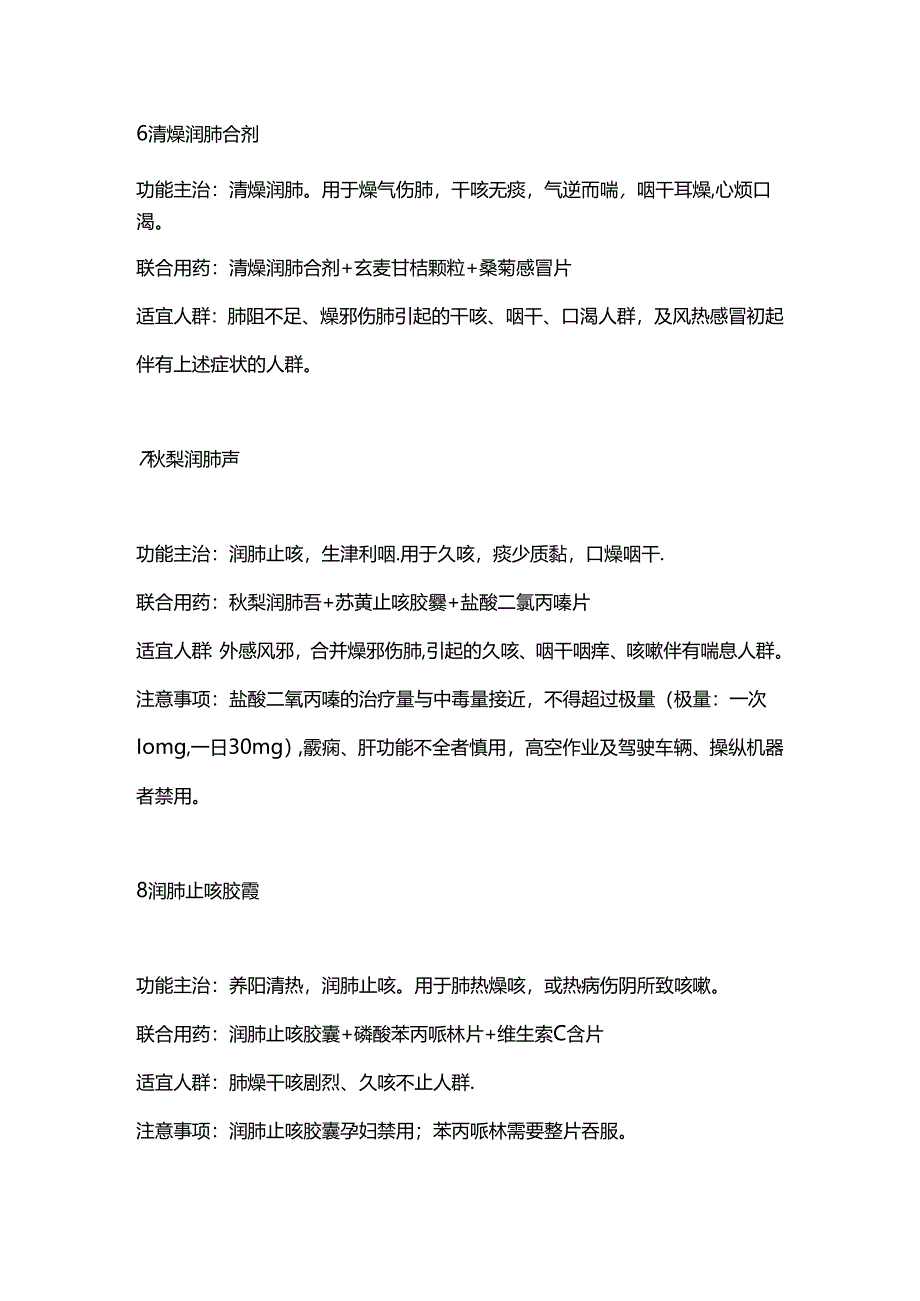3、美沙芬愈创甘油醛糖浆适宜人群:肺燥、肺热咳嗽伴有少量痰液的人群。注意事项:肺气不足,感冒风寒者忌服复方罗汉果止咳颗粒。6清燥润肺合剂功能主治:清燥润肺。用于燥气伤肺,干咳无痰,气逆而喘,咽干耳燥,心烦口渴。联合用药:清燥润肺合剂+玄麦甘桔颗粒+桑菊感冒片适宜人群:肺阻不足、燥邪伤肺引起的干咳、咽干、口渴人群,及风热感冒初起伴有上述症状的人群。7秋梨润肺声功能主治:润肺止咳,生津利咽.用于久咳,痰少质黏,口燥咽干.联合用药:秋梨润肺吾+苏黄止咳胶爨+盐酸二氯丙嗪片适宜人群:外感风邪,合并燥邪伤肺,引起的久咳、咽干咽痒、咳嗽伴有喘息人群。注意事项:盐酸二氧丙嗪的治疗量与中毒量接近,不得超过极量(极量:一次Iomg,一日30mg),霰痫、肝功能不全者慎用,高空作业及驾驶车辆、操纵机器者禁用。8润肺止咳胶霞功能主治:养阳清热,润肺止咳。用于肺热燥咳,或热病伤阴所致咳嗽。联合用药:润肺止咳胶囊+磷酸苯丙哌林片+维生索C含片适宜人群:肺燥干咳剧烈、久咳不止人群.注意事项:润肺止咳胶囊孕妇禁用;苯丙哌林需要整片吞服。