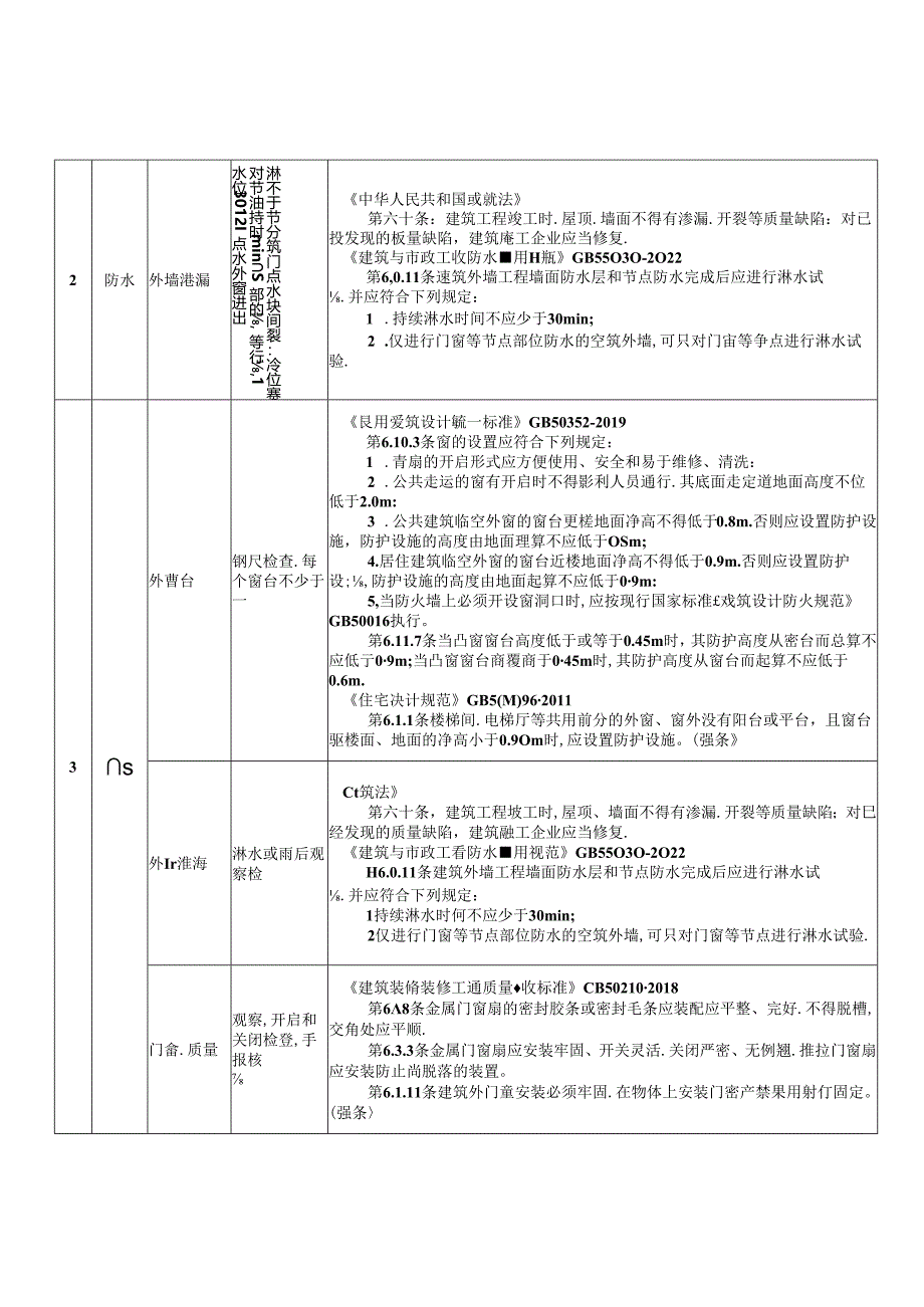 5、防水层和饰面层完成后,均应进行蓄水试旌.鹿筑地面工电Jt工质验收视落GB50209-2010第4.9.3条有防水要求的建筑地面工程,铺设前必须对立管、杰管和地潺与接收节点之间进行密封处理,并应进行隐藏验收:排水坡度应符合设计要求。2防水外墙港漏淋不于节分筑门点水块间裂:冷位赛对节油持时minS部的,等行,1水位3012I点水外窗进出中华人民共和国或就法第六十条:建筑工程竣工时.屋顶.墙面不得有渗漏.开裂等质量缺陷:对已投发现的板量缺陷,建筑庵工企业应当修复.建筑与市政工收防水用H瓶GB55O3O-2O22第6,0.11条速筑外墙工程墙面防水层和节点防水完成后应进行淋水试.并应符合下列规定:1