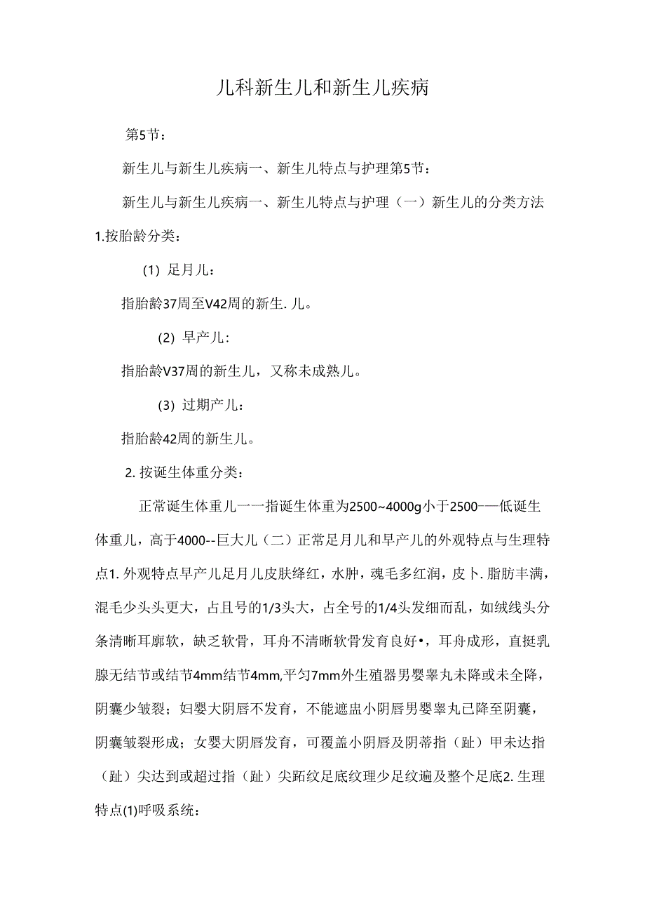 1、儿科新生儿和新生儿疾病第5节:新生儿与新生儿疾病一、新生儿特点与护理第5节:新生儿与新生儿疾病一、新生儿特点与护理(一)新生儿的分类方法1.按胎龄分类:(1)足月儿:指胎龄37周至V42周的新生.儿。(2)早产儿:指胎龄V37周的新生儿,又称未成熟儿。(3)过期产儿:指胎龄42周的新生儿。2.按诞生体重分类:正常诞生体重儿一一指诞生体重为25004000g小于2500-低诞生体重儿,高于4000-巨大儿(二)正常足月儿和早产儿的外观特点与生理特点1.外观特点早产儿足月儿皮肤绛红,水肿,魂毛多红润,皮卜.脂肪丰满,混毛少头头更大,占且号的1/3头大,占全号的1/4头发细而乱,如绒线头分条清晰耳廓