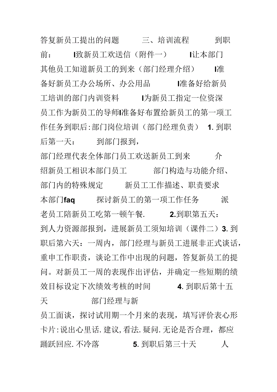 3、、部门内的特殊规定新员工工作描述、职责要求本部门faq探讨新员工的第一项工作任务派老员工陪新员工吃第一顿午餐.2.到职第五天:到人力资源部报到,进展新员工须知培训(课件二)3.到职后第六天:一周内,部门经理与新员工进展非正式谈话,重申工作职责,谈论工作中出现的问题,答复新员工的提问。对新员工一周的表现作出评估,并确定一些短期的绩效目标设定下次绩效考核的时间4.到职后第十五天部门经理与新员工面谈,探讨试用期一个月来的表现,填写评价表心形卡片:说出心里话.建议,看法.疑问.无论是否合理,都应踊跃回应.不冷落5.到职后第三十天人力资源部经理与部门经理一起探讨新员工表现,是否相宜此时此刻岗位,填写试用