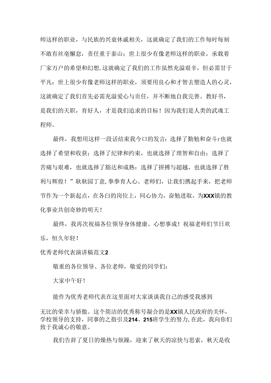 4、共创奇妙的明天!最终,我再次祝福各位领导身体健康、心想事成!祝福老师们节日欢乐,恒久年轻!优秀老师代表演讲稿范文2敬重的各位领导、各位老师,敬爱的同学们:大家中午好!能作为优秀老师代表在这里面对大家谈谈我自己的感受我感到无比的荣幸与骄傲。这个简洁的优秀称号凝合的是XX镇人民政府的关怀,学校领导的支持,同事的之指引及214、215班学生的努力,在此,我向你们致于我诚心的敬意。我们告辞了夏日的燥热与烦躁,迎来了秋天的凉快与思索,秋天是收获的季节,我们在这里共同庆祝XX中学XXX学年开学典礼,祈求明年更丰收。作为老师,我们受人敬重,得到拥护,桃李满天下,同时.,我们的责任重于泰山,国运兴衰,系与教化