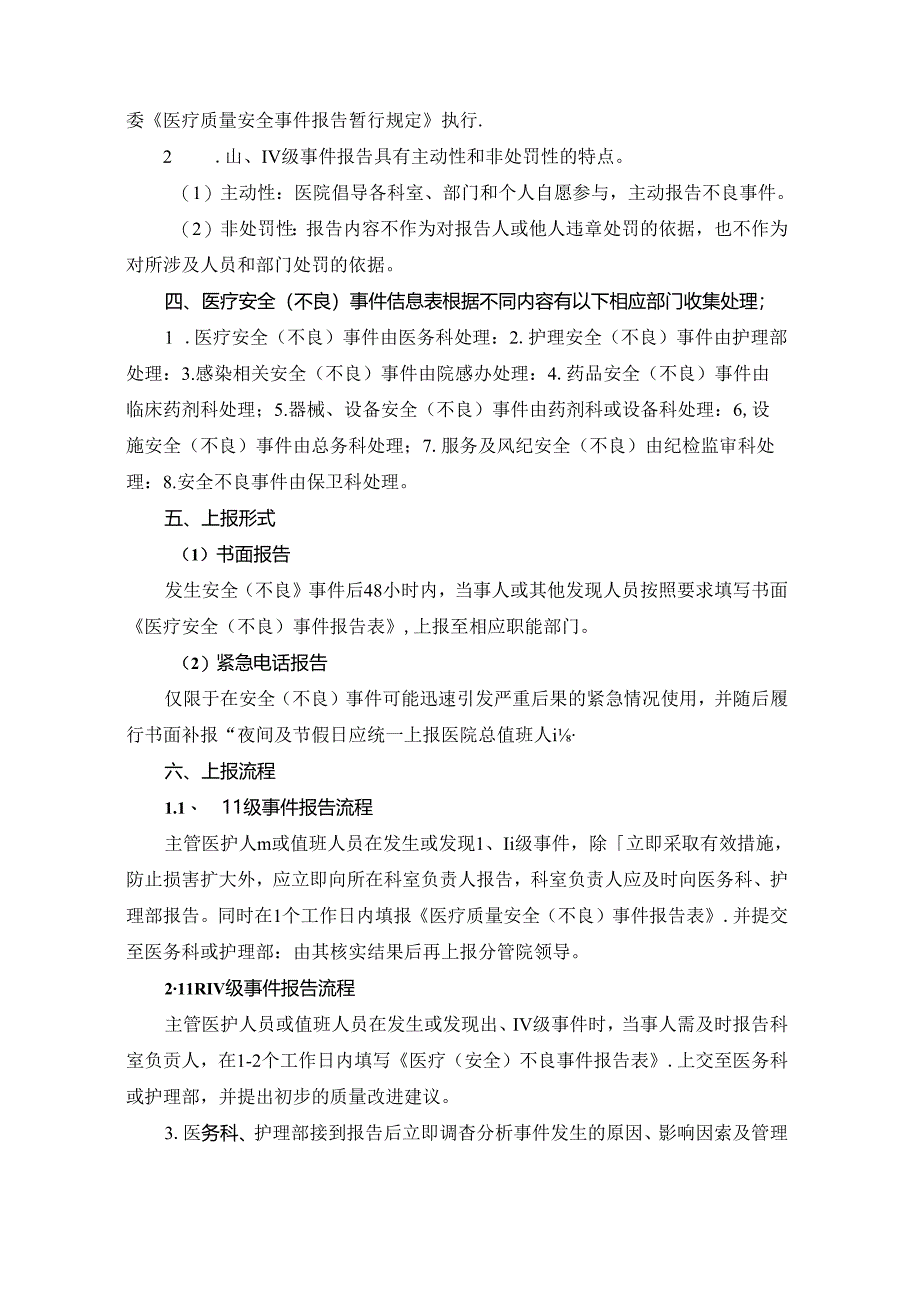 4、处罚的依据。四、医疗安全(不良)事件佶息表根据不同内容有以下相应部门收集处理;1 .医疗安全(不良)事件由医务科处理:2.护理安全(不良)事件由护理部处理:3.感染相关安全(不良)事件由院感办处理:4.药品安全(不良)事件由临床药剂科处理;5.器械、设备安全(不良)事件由药剂科或设备科处理:6,设施安全(不良)事件由总务科处理;7.服务及风纪安全(不良)由纪检监审科处理:8.安全不良事件由保卫科处理。五、上报形式(1)书面报告发生安全(不良事件后48小时内,当事人或其他发现人员按照要求填写书面医疗安全(不良)事件报告表,上报至相应职能部门。(2)紧急电话报告仅限于在安全(不良)事件可能迅速引发