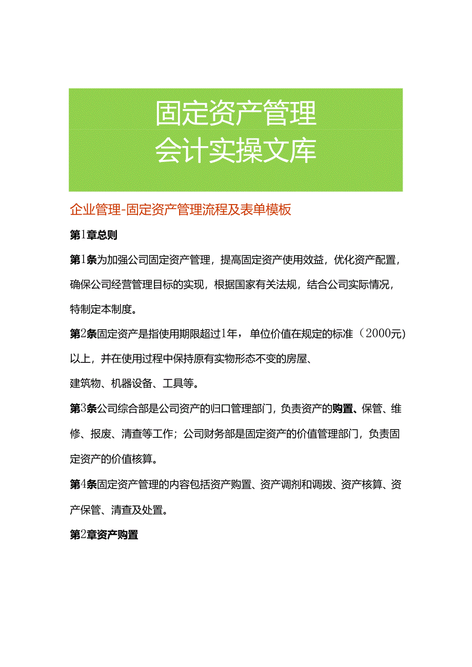 1、固定资产管理会计实操文库企业管理-固定资产管理流程及表单模板第1章总则第1条为加强公司固定资产管理,提高固定资产使用效益,优化资产配置,确保公司经营管理目标的实现,根据国家有关法规,结合公司实际情况,特制定本制度。第2条固定资产是指使用期限超过1年,单位价值在规定的标准(2000元)以上,并在使用过程中保持原有实物形态不变的房屋、建筑物、机器设备、工具等。第3条公司综合部是公司资产的归口管理部门,负责资产的购置、保管、维修、报废、清查等工作;公司财务部是固定资产的价值管理部门,负责固定资产的价值核算。第4条固定资产管理的内容包括资产购置、资产调剂和调拨、资产核算、资产保管、清查及处置。第2章资