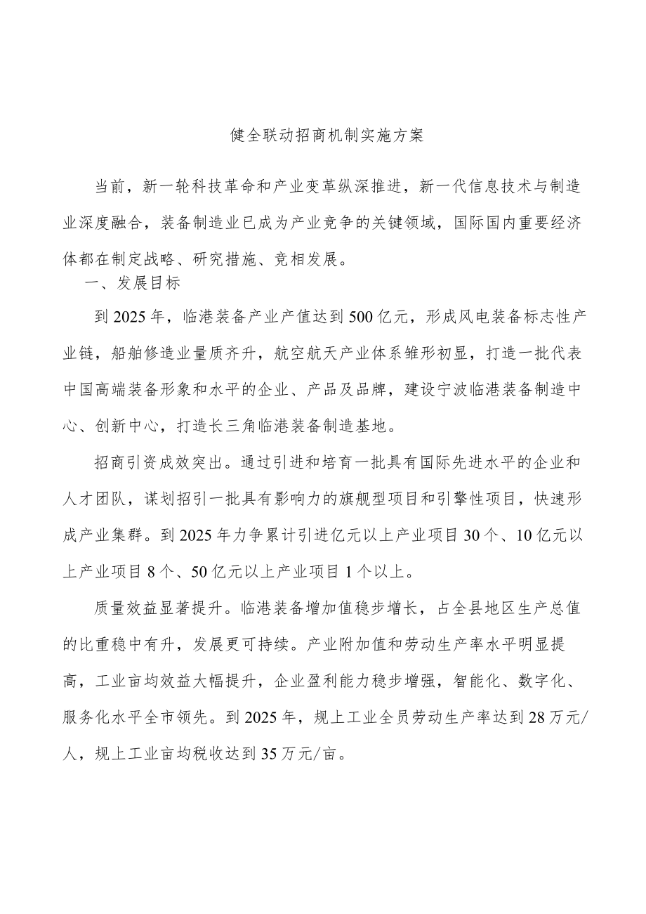 1、健全联动招商机制实施方案当前,新一轮科技革命和产业变革纵深推进,新一代信息技术与制造业深度融合,装备制造业已成为产业竞争的关键领域,国际国内重要经济体都在制定战略、研究措施、竞相发展。一、发展目标到2025年,临港装备产业产值达到500亿元,形成风电装备标志性产业链,船舶修造业量质齐升,航空航天产业体系雏形初显,打造一批代表中国高端装备形象和水平的企业、产品及品牌,建设宁波临港装备制造中心、创新中心,打造长三角临港装备制造基地。招商引资成效突出。通过引进和培育一批具有国际先进水平的企业和人才团队,谋划招引一批具有影响力的旗舰型项目和引擎性项目,快速形成产业集群。到2025年力争累计引进亿元以上