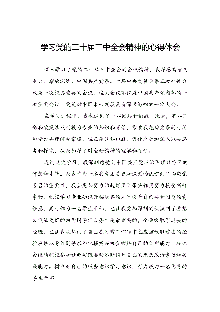 1、学习党的二十届三中全会精神的心得体会深入学习了党的二十届三中全会的会议精神,我深感其意义重大,影响深远。中国共产党第二十届中央委员会第三次全体会议是一次极其重要的会议,这次会议不仅是中国共产党内部的一次重要会议,更是对中国未来发展具有深远影响的一次大会。在学习过程中,我也遇到了一些困难和挑战。比如,有些理念和政策涉及到较为专业的知识和背景,需要我花费更多的时间和精力去理解和掌握。但正是这些挑战,促使我更加深入地去思考和探究,从而加深了对全会精神的理解和领悟。通过这次学习,我深刻感受到中国共产党在治国理政方面的智慧和才能。而我作为一名共青团员更加深刻的认识到了响应党号召的重要性,我会更加努力的起