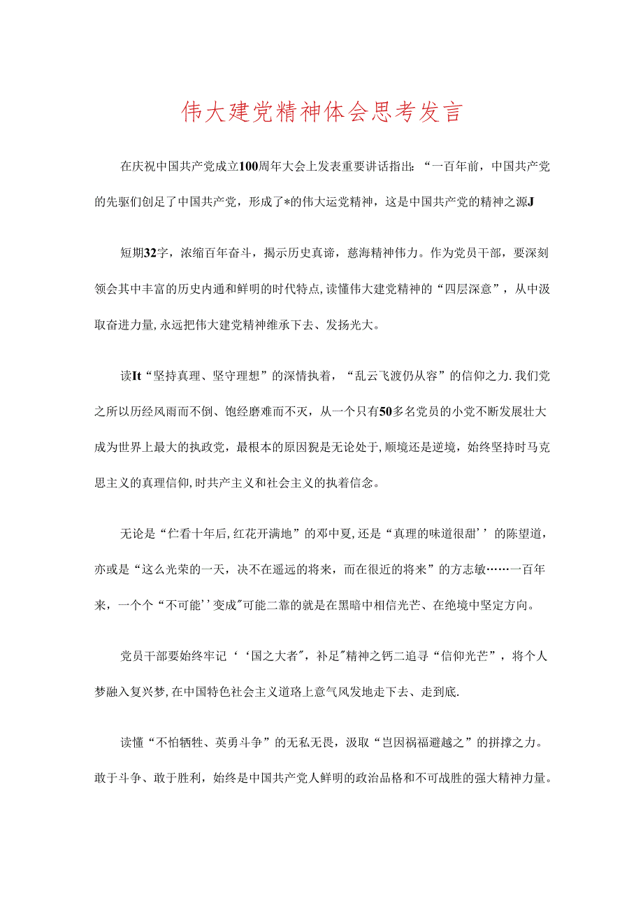 《伟大建党精神体会思考发言.docx》由会员分享,可在线阅读,更多相关《伟大建党精神体会思考发言.docx(3页珍藏版)》请在第壹文秘上搜索。