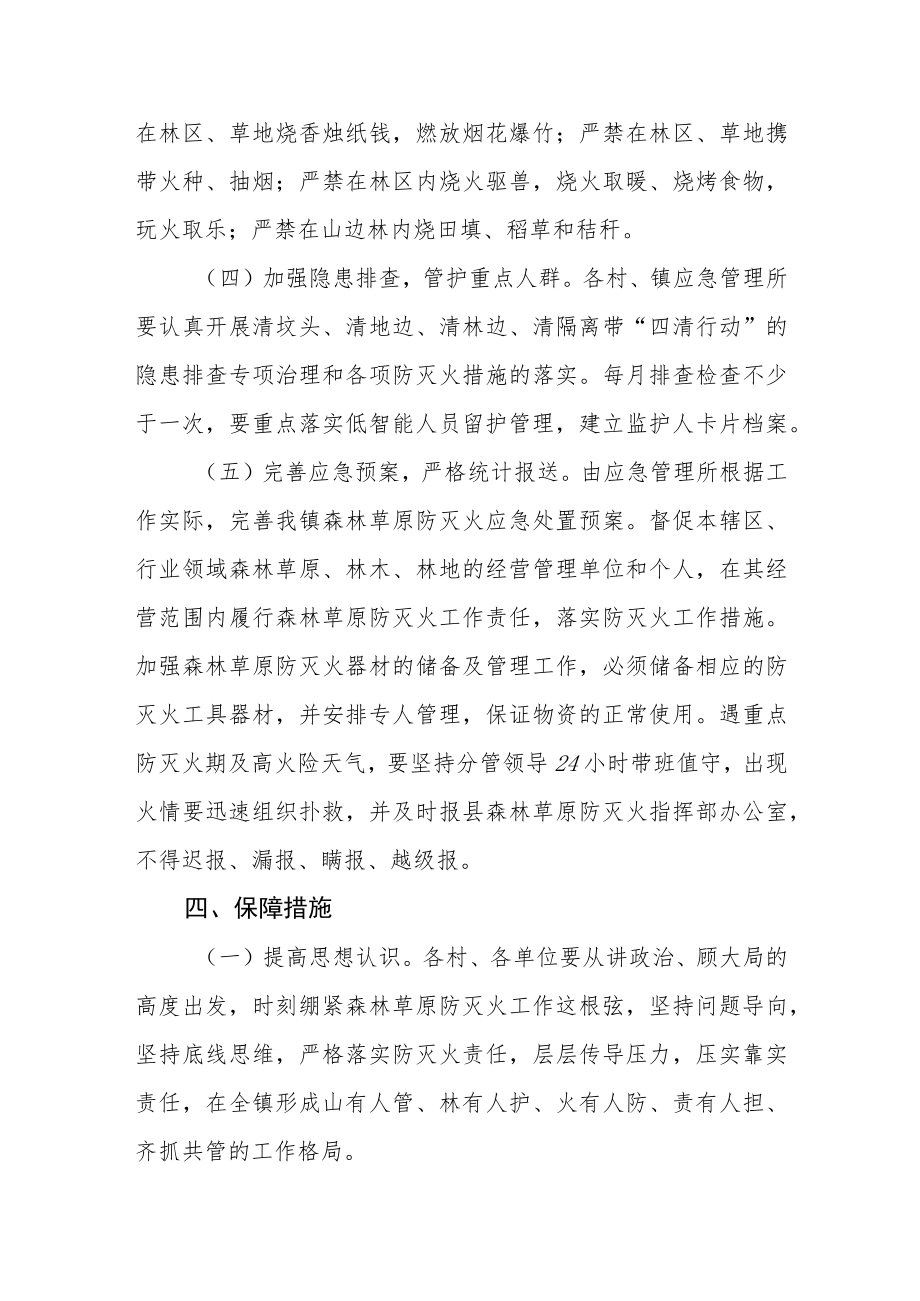 2、林防灭火,人人有责”的浓厚氛围。确保辖区不发生重大森林草原火灾;不发生重大人员伤亡事故。三、工作措施(一)加强组织领导,靠实工作责任。镇村要建立健全森林草原防灭火指挥机构,定期研究森林草原防灭火工作。设立森林草原防灭火办公室,配备专(兼)职人员不得少于2名,指挥机构成员不得少于5名。建立20人以上的义务森林草原应急消防救援队伍(以青壮年、退伍军人、民兵为主),建立主要领导带班、巡逻队、村级护林(草)员巡山等制度。镇政府主要负责人是本乡镇辖区森林草原防灭火工作第一责任人,分管领导和各村主任是森林草原防灭火工作的直接责任人。镇上与各村、社、护林员要层层签订森林草原防灭火责任书,建立健全森林草原防灭