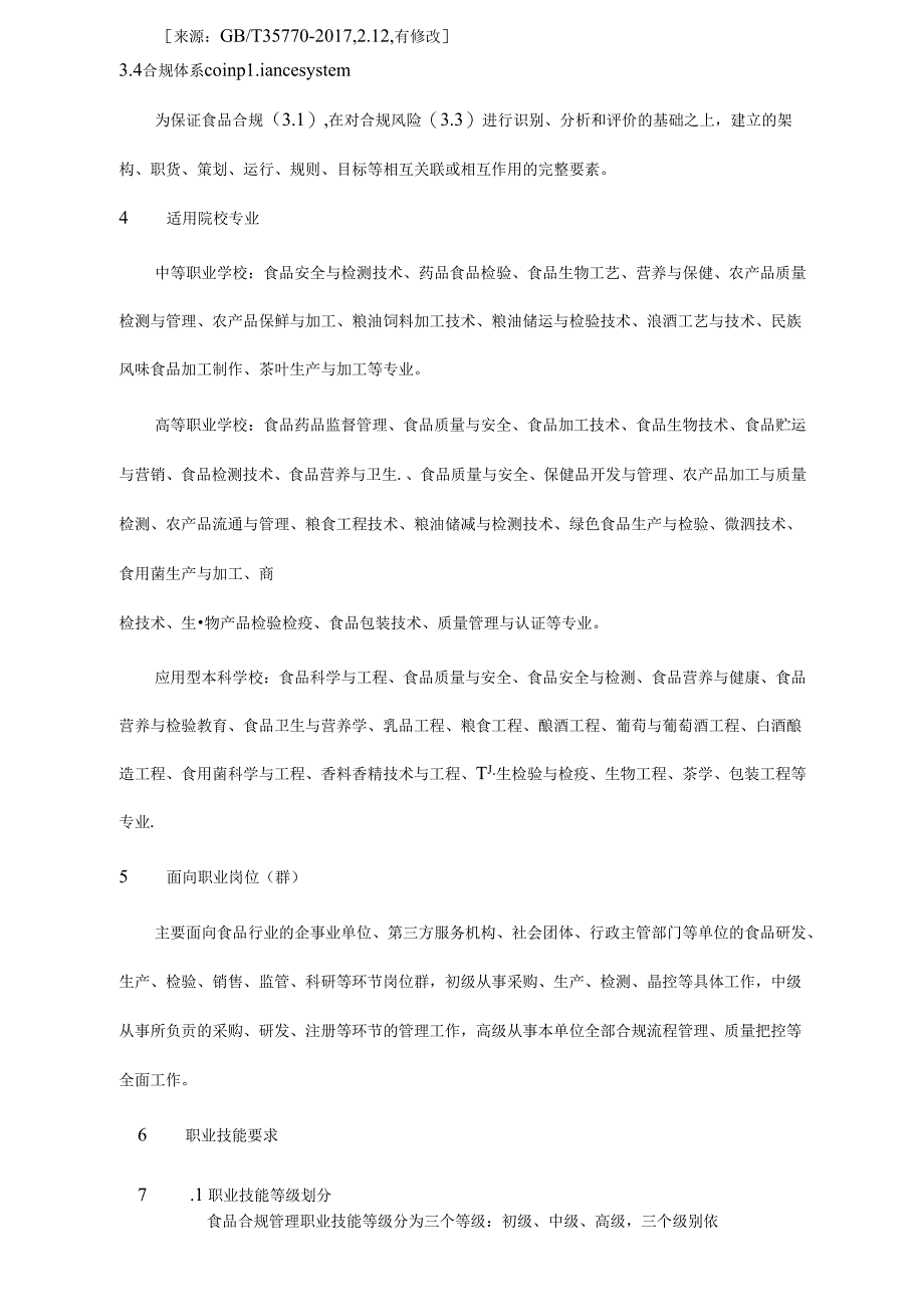 1、1+X食品合规管理职业技能等级标准1 范围本标准规定/食品合规管理职业技能等级对应的工作领域、工作任务及职业技能要求。本标准适用于食品合规管理职业技能培训、考核与评价,相关用人单位的人员聘用、培训与考核可参照使用.2 规范性引用文件下列文件对于本标准的应用是必不可少的。凡是注日期的引用文件,仪注日期的版本适用于本标准,凡是不注日期的引用文件,其最新版本适用本标准.GB/T35770合规管理体系指南3 术语和定义GB/T35770界定的以及下列术语和定义适用于本标准。3.1食品合规foodcomp1.iance食品生产经营者的生产经营行为符合食品相关法律法规、规章、标准、行业准则和企业章程、规章