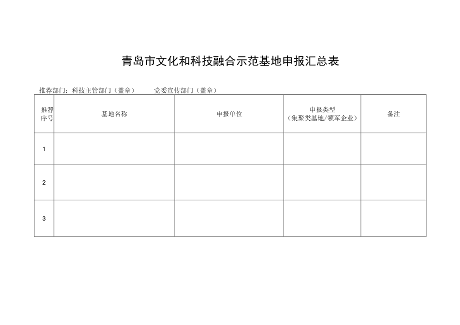青岛市文化和科技融合示范基地申报汇总表推荐部门:科技主管部门(盖章)党委宣传部门(盖章)推荐序号基地名称申报单位申报类型(集聚类基地/领军企业)备注123