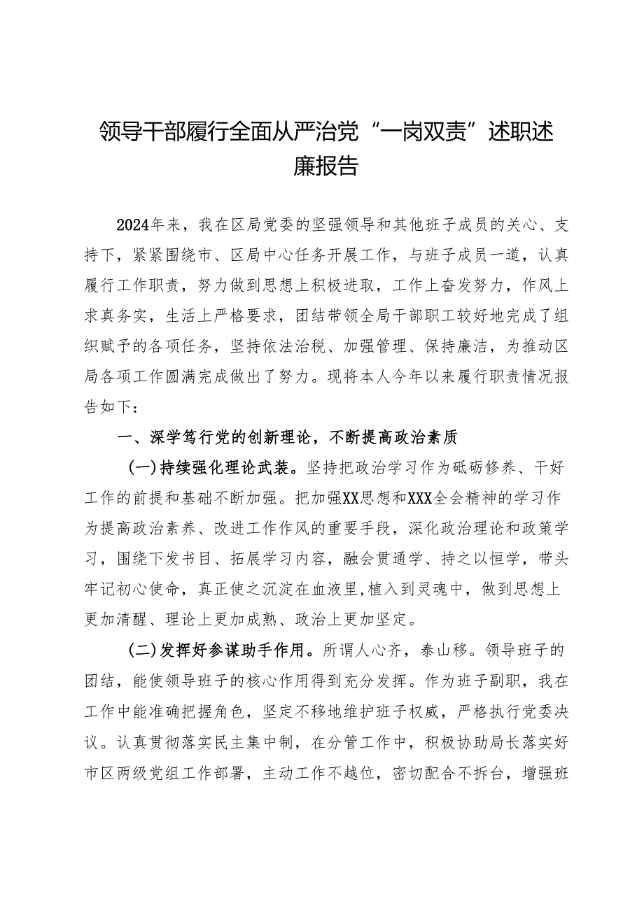 1、领导干部履行全面从严治党“一岗双责”述职述廉报告2024年来,我在区局党委的坚强领导和其他班子成员的关心、支持下,紧紧围绕市、区局中心任务开展工作,与班子成员一道,认真履行工作职责,努力做到思想上积极进取,工作上奋发努力,作风上求真务实,生活上严格要求,团结带领全局干部职工较好地完成了组织赋予的各项任务,坚持依法治税、加强管理、保持廉洁,为推动区局各项工作圆满完成做出了努力。现将本人今年以来履行职责情况报告如下:一、深学笃行党的创新理论,不断提高政治素质(一)持续强化理论武装。坚持把政治学习作为砥砺修养、干好工作的前提和基础不断加强。把加强XX思想和XXX全会精神的学习作为提高政治素养、改进工
