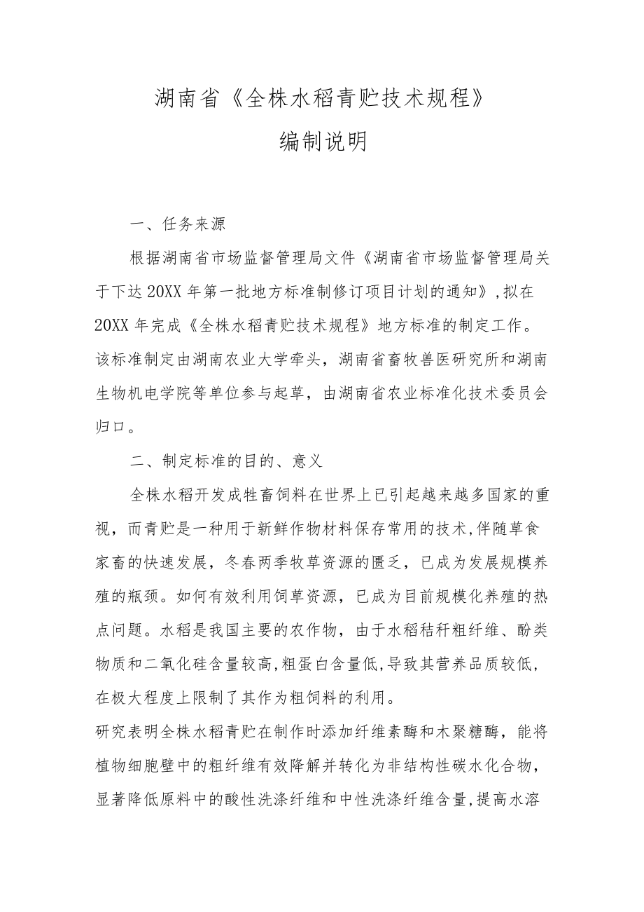 1、湖南省全株水稻青贮技术规程编制说明一、任务来源根据湖南省市场监督管理局文件湖南省市场监督管理局关于下达20XX年第一批地方标准制修订项目计划的通知,拟在20XX年完成全株水稻青贮技术规程地方标准的制定工作。该标准制定由湖南农业大学牵头,湖南省畜牧兽医研究所和湖南生物机电学院等单位参与起草,由湖南省农业标准化技术委员会归口。二、制定标准的目的、意义全株水稻开发成牲畜饲料在世界上已引起越来越多国家的重视,而青贮是一种用于新鲜作物材料保存常用的技术,伴随草食家畜的快速发展,冬春两季牧草资源的匮乏,已成为发展规模养殖的瓶颈。如何有效利用饲草资源,已成为目前规模化养殖的热点问题。水稻是我国主要的农作物,