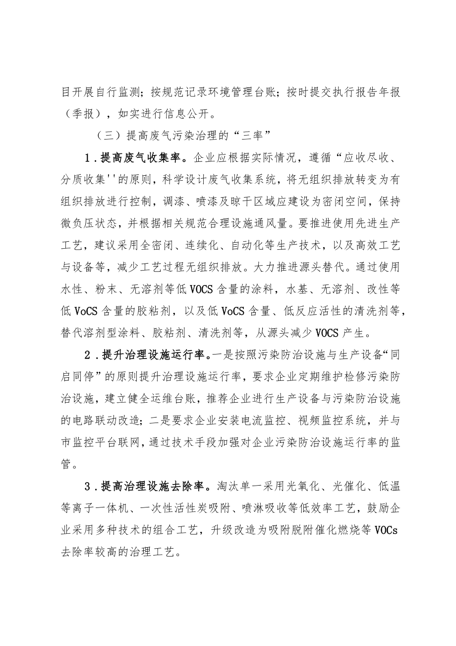 2、后一并按照此文件要求开展治理)。四、整治要求(一)完善环保手续环保审批、验收手续齐全;生产经营地址、规模、生产工艺、产品种类与审批内容一致。(二)规范排污许可管理应符合排污许可管理级别要求;按照排污许可证要求的频次、项目开展自行监测;按规范记录环境管理台账;按时提交执行报告年报(季报),如实进行信息公开。(三)提高废气污染治理的“三率”1 .提高废气收集率。企业应根据实际情况,遵循“应收尽收、分质收集的原则,科学设计废气收集系统,将无组织排放转变为有组织排放进行控制,调漆、喷漆及晾干区域应建设为密闭空间,保持微负压状态,并根据相关规范合理设施通风量。要推进使用先进生产工艺,建议采用全密闭、连续