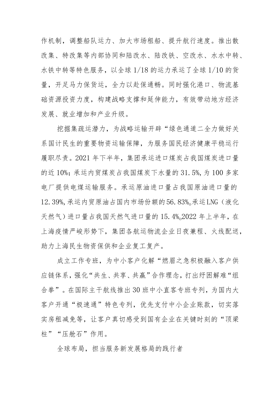 1、【中心组研讨发言】勇当物畅其流的开路先锋党的十八大以来,习近平总书记对建设海洋强国、航运强国作出一系列重要论述,特别是在上海考察期间深刻指出“经济强国必定是海洋强国、航运强国”,为推动我国航运业实现更可持续、更高质量发展提供了根本遵循,为加快建设海洋强国、航运强国汇聚了磅礴力量。在百年变局和世纪疫情相互叠加的复杂局面下,航运业的战略性地位充分彰显。中国远洋海运集团作为全球最大综合性航运物流企业,心怀“国之大者”,把握“强国使命”,坚决贯彻落实党中央“疫情要防住、经济要稳住、发展要安全”的明确要求,在助力稳经济大盘、保障供应链畅通中勇当物畅其流的开路先锋。陆海联动,担当保障产业链供应链稳定的联通