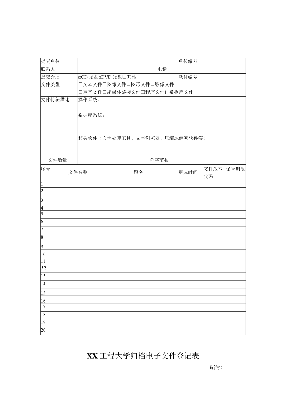 《XX工程大学归档电子文件登记表.docx》由会员分享,可在线阅读,更多相关《XX工程大学归档电子文件登记表.docx(2页珍藏版)》请在第壹文秘上搜索。