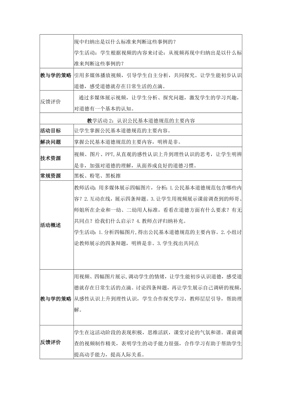 3、活跃,勇于回答问题,具备一定的洞察力和分析问题的能力,但对如何遵守道德规范,提高道德修养缺乏认识。重点、难点本课的教学重点是:道德规范的基本内容、社会公德的主要内容本课的教学难点是:践行社会公德基本规范教与学的媒体选择多媒体、视频、图片、PPT课程实施类型偏教师课堂讲授类偏自主、合作、探究学习类备注教学活动步骤序号1导入、新课呈现2问题讨论3提升拓展4课堂小结5教学活动详情教学活动L新课呈现活动目标让学生掌握道德的含义与特点解决问题让学生理解并掌握道德的含义与特点技术资源播放视频,根据视频环节引导学生从生活点滴中认识“道德”,并从视频再现中归纳出是以什么标准来判断这些事例的?常规资源黑板、粉笔