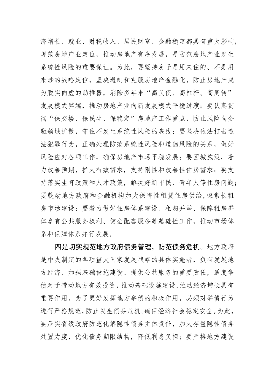 4、代科技手段和支付结算机制,实时动态监管线上线下、国际国内的资金流向流量;要完善规范金融运行的制度体系,确保金融系统良性运转;要把金融活动全部纳入金融监管,金融创新必须在审慎监管的前提下进行,守住不发生系统性金融风险的底线;要加强对金融机构高管、主要股东资质审核和行为监管,有效隔离产业资本和金融风险;要统筹好防范重大金融风险和道德风险,压实各方责任,及时加以处置,防止形成区域性、系统性金融风险;要创新完善权力监督制度和执纪执法体系,做到惩治金融领域腐败和处置金融风险同步推进、严肃追责和追赃挽损同步推进、建立制度和强化制度执行同步推进。三是切实规范房地产业,推动房地产有序发展。房地产对经济增长、就