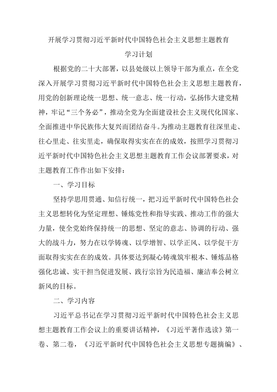 1、开展学习贯彻习近平新时代中国特色社会主义思想主题教育学习计划根据党的二十大部署,以县处级以上领导干部为重点,在全党深入开展学习贯彻习近平新时代中国特色社会主义思想主题教育,用党的创新理论统一思想、统一意志、统一行动,弘扬伟大建党精神,牢记“三个务必”,推动全党为全面建设社会主义现代化国家、全面推进中华民族伟大复兴而团结奋斗。为推动主题教育往深里走、往心里走、往实里走,确保取得实实在在的成效,按照学习贯彻习近平新时代中国特色社会主义思想主题教育工作会议部署要求,对主题教育工作作出如下安排:一、学习目标坚持学思用贯通、知信行统一,把习近平新时代中国特色社会主义思想转化为坚定理想、锤炼党性和指导实践