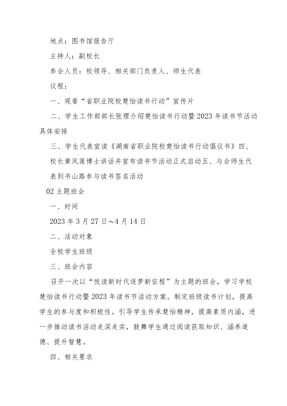 2、院,环境监测学院,环境资源学院,环境艺术与建筑学院,环境经济与信息学院主要负责人。01启动大会时间:2023年3月27日下午3:00地点:图书馆报告厅主持人:副校长参会人员:校领导、相关部门负责人、师生代表议程:一、观看“省职业院校楚怡读书行动”宣传片二、学生工作部部长张理介绍楚怡读书行动暨2023年读书节活动具体安排三、学生代表宣读湖南省职业院校楚怡读书行动倡议书四、校长黄凤莲博士讲话并宣布读书节活动正式启动五、与会师生代表到书山路参与读书签名活动02主题班会一、时间2023年3月27日4月14日二、活动对象全校学生班级三、班会内容召开一次以“悦读新时代逐梦新征程”为主题的班会,学习学校楚怡