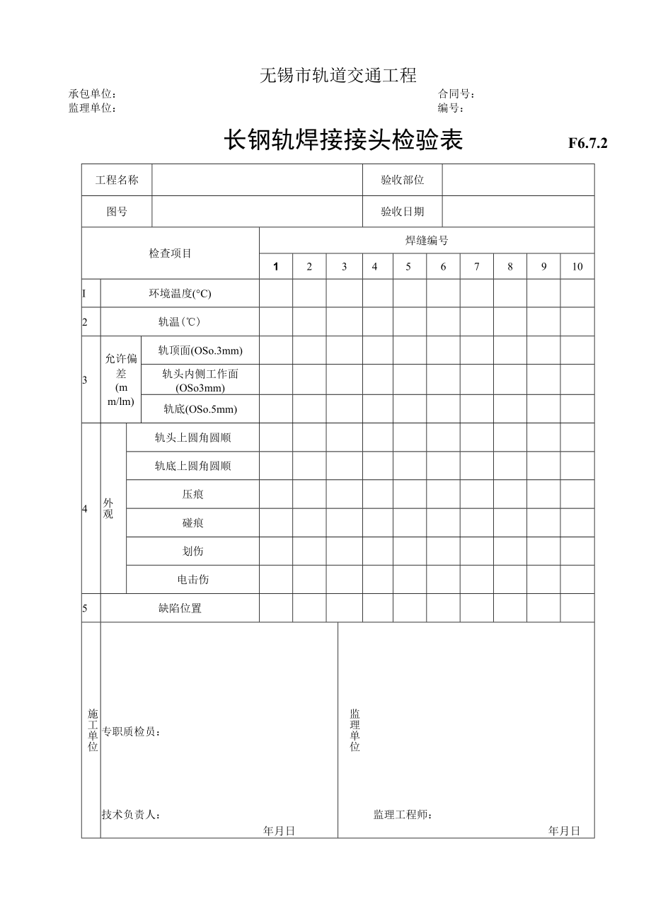 2、5)压痕碰痕 划伤 电击伤轨头上圆角轨底上圆角圆顺圆顺施工单位专职质检员:技术负责人:监理单位监理工程师:工程名称验收部位图号验收日期焊接方法钢轨编号焊接口期仪器型号焊接设备焊接班组长探伤缝号焊编位置探头入射角折射角频-MHZ灵敏度无陷有缺探伤缺陷位置及说明轨头A轨腰轨底轨头轨腰轨底轨头轨腰轨底轨头1轨腰轨底无锡市轨道交通工程承包单位:合同号:监理单位:编号:长钢轨焊接接头检验表F6.7.2工程名称验收部位图号验收日期检查项目焊缝编号12345678910I环境温度(C)2轨温()3允许偏差(mm/lm)轨顶面(OSo.3mm)轨头内侧工作面(OSo3mm)轨底(OSo.5mm)4外观轨头上圆