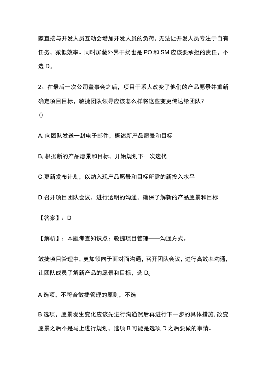 2、主题专家的意见,综合其他专家的意见一起做决策,可以体现集体决策的原则,故选则B选项。不能减弱主题专家的作用,而是要充分利用,A的做法不合适,不选Ao让开发人员使用主题专家的大量文档,会削弱敏捷性,使很多工作产生浪费,不选Co让主题专家直接与开发人员互动会增加开发人员的负荷,无法让开发人员专注于自有任务,减低效率。同时屏蔽外界干扰也是PO和SM应该要承担的责任,不选Do2、在最后一次公司董事会之后,项目干系人改变了他们的产品愿景并重新确定项目目标,敏捷团队领导应该怎么样将这些变更传达给团队?()A,向团队发送一封电子邮件,概述新产品愿景和目标B,根据新的产品愿景和目标,开始规划下一次迭代C.更新