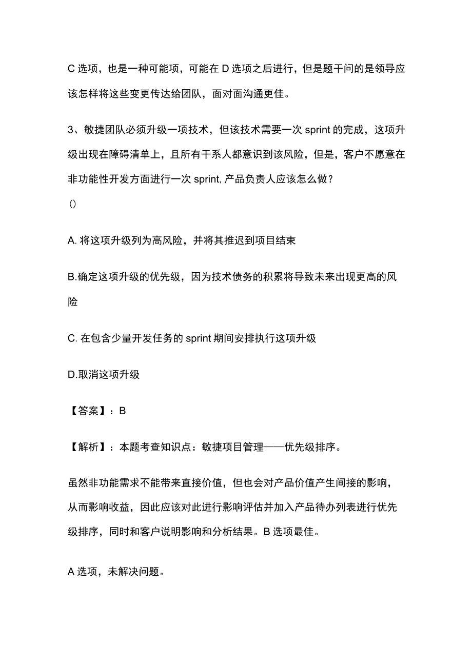 4、rint的完成,这项升级出现在障碍清单上,且所有干系人都意识到该风险,但是,客户不愿意在非功能性开发方面进行一次sprint,产品负责人应该怎么做?()A.将这项升级列为高风险,并将其推迟到项目结束B.确定这项升级的优先级,因为技术债务的积累将导致未来出现更高的风险C.在包含少量开发任务的sprint期间安排执行这项升级D.取消这项升级【答案】:B【解析】:本题考查知识点:敏捷项目管理优先级排序。虽然非功能需求不能带来直接价值,但也会对产品价值产生间接的影响,从而影响收益,因此应该对此进行影响评估并加入产品待办列表进行优先级排序,同时和客户说明影响和分析结果。B选项最佳。A选项,未解决问题。C