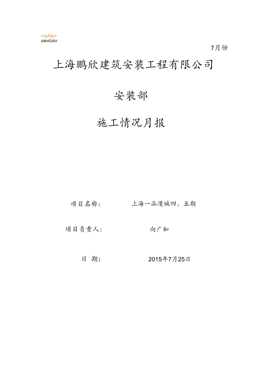 1、7月份kWrIGXlrI上海鹏欣建筑安装工程有限公司安装部施工情况月报项目名称:上海一品漫城四、五期向广和项目负责人:日 期:2015年7月25日本月实际完成情况:(后附月度施工进度计划表,统一采用横道图格式)见付表:(篮色线条是本月原计划,红色线条代表实际完成情况,黑线 代表完成至此刻所用时间,黄色线条代表下个月计划。)四期:L 1#5#楼防火封堵结束。2. 2#、3#楼穿室内总线、装配电箱内胆、室内调试结束。3. 2#、3#楼通水、通球与物业交房完成30设4. 1#组团室内穿照明线结束、4#组团室内穿照明线完成75机5. 1#、4#组团室内给水管安装结束,地下室给排水管刷漆结束。6. 1#