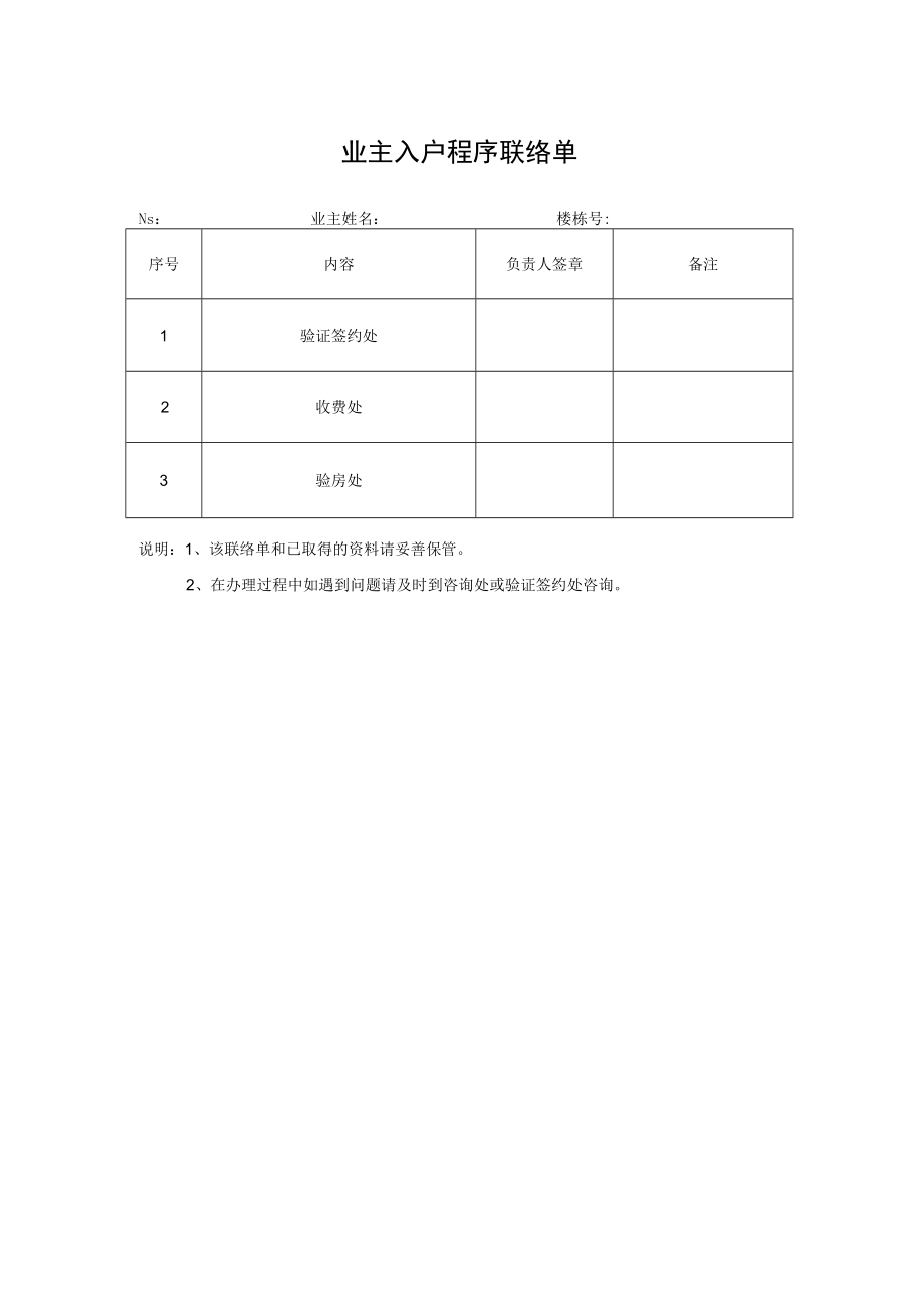 业主入户程序联络单Ns:业主姓名:楼栋号:序号内容负责人签章备注1验证签约处2收费处3验房处说明:1、该联络单和已取得的资料请妥善保管。2、在办理过程中如遇到问题请及时到咨询处或验证签约处咨询。