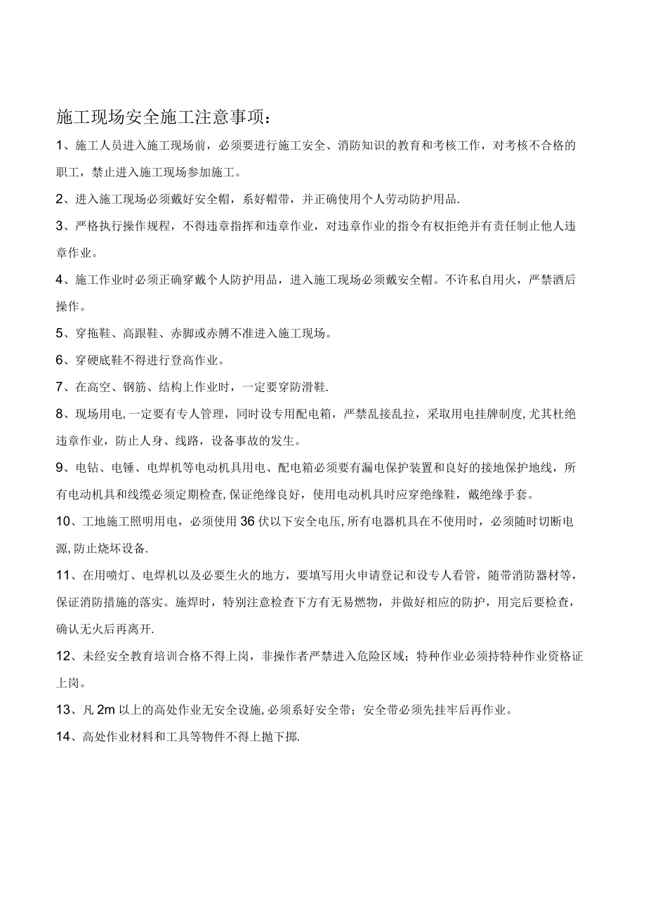1、施工现场安全施工注意事项:1、施工人员进入施工现场前,必须要进行施工安全、消防知识的教育和考核工作,对考核不合格的职工,禁止进入施工现场参加施工。2、进入施工现场必须戴好安全帽,系好帽带,并正确使用个人劳动防护用品.3、严格执行操作规程,不得违章指挥和违章作业,对违章作业的指令有权拒绝并有责任制止他人违章作业。4、施工作业时必须正确穿戴个人防护用品,进入施工现场必须戴安全帽。不许私自用火,严禁酒后操作。5、穿拖鞋、高跟鞋、赤脚或赤膊不准进入施工现场。6、穿硬底鞋不得进行登高作业。7、在高空、钢筋、结构上作业时,一定要穿防滑鞋.8、现场用电,一定要有专人管理,同时设专用配电箱,严禁乱接乱拉,采取