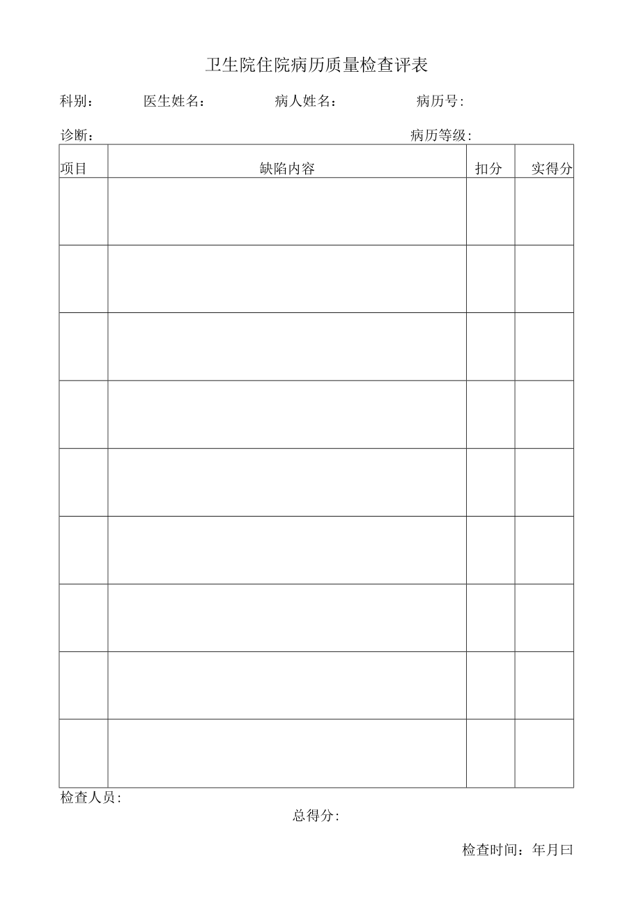 卫生院住院病历质量检查评表科别:医生姓名:病人姓名:病历号:诊断:病历等级:项目缺陷内容扣分实得分检查人员:总得分:检查时间:年月曰