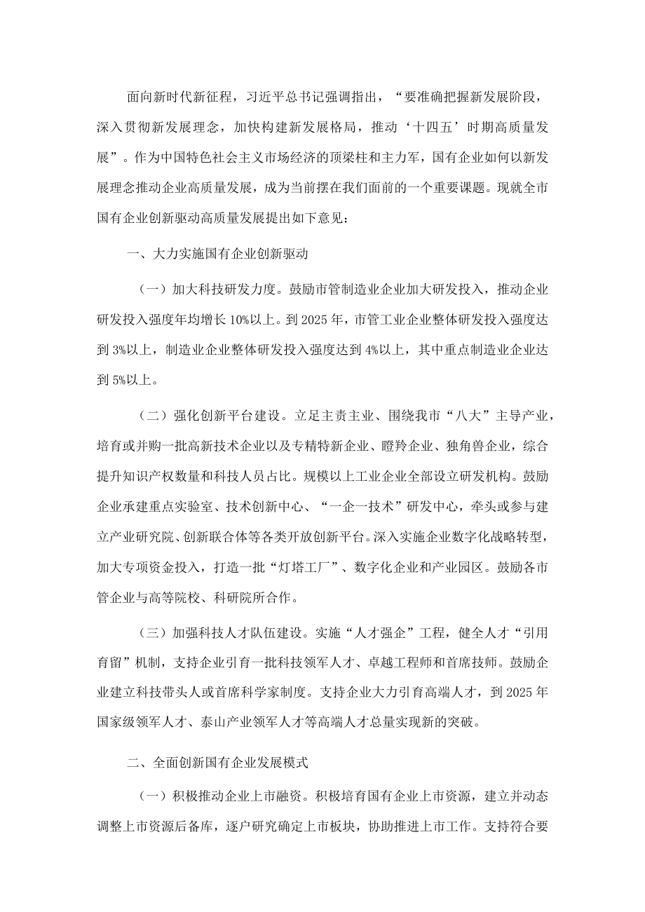 1、面向新时代新征程,习近平总书记强调指出,“要准确把握新发展阶段,深入贯彻新发展理念,加快构建新发展格局,推动十四五时期高质量发展”。作为中国特色社会主义市场经济的顶梁柱和主力军,国有企业如何以新发展理念推动企业高质量发展,成为当前摆在我们面前的一个重要课题。现就全市国有企业创新驱动高质量发展提出如下意见:一、大力实施国有企业创新驱动(一)加大科技研发力度。鼓励市管制造业企业加大研发投入,推动企业研发投入强度年均增长10%以上。到2025年,市管工业企业整体研发投入强度达到3%以上,制造业企业整体研发投入强度达到4%以上,其中重点制造业企业达到5%以上。(二)强化创新平台建设。立足主责主业、围绕