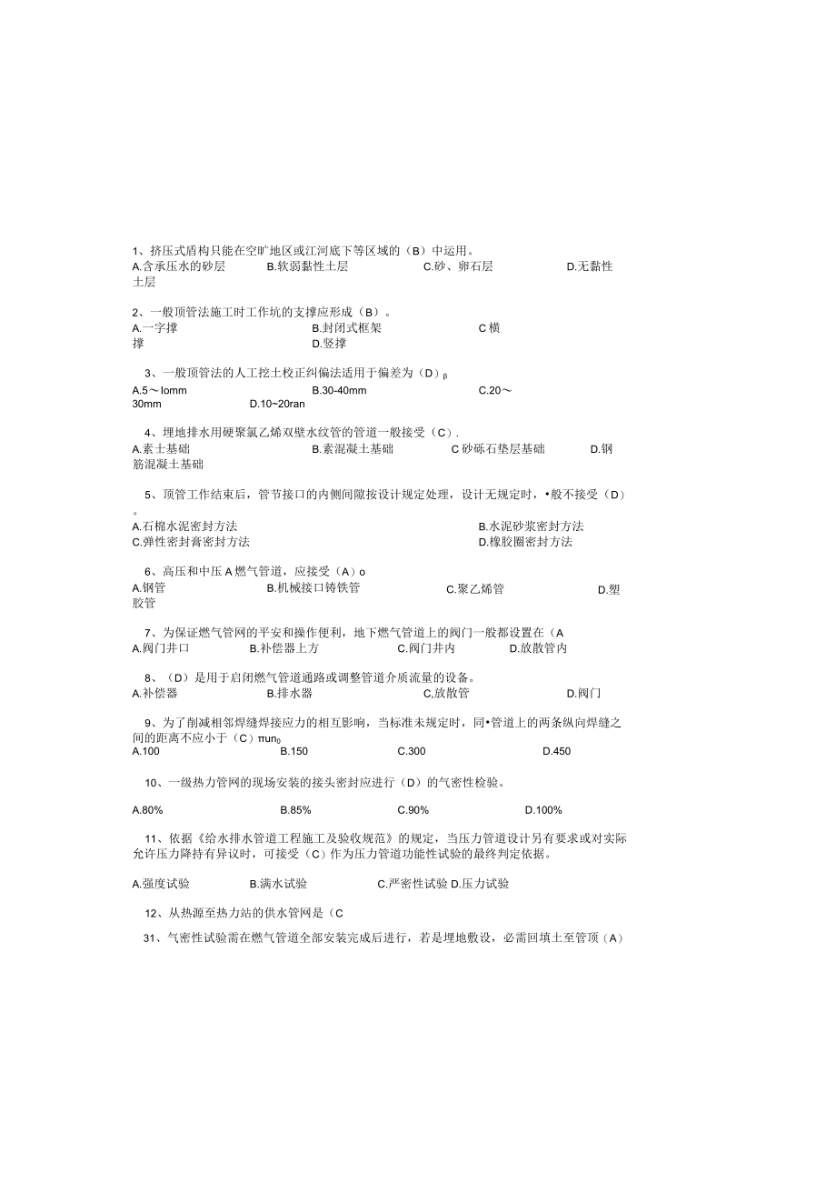 3、521、热力管网试运行的时间为:应在设计参数下连续热运行(D)h。A.24B.36C.48D.72一、单选1、挤压式盾构只能在空旷地区或江河底下等区域的(B)中运用。A.含承压水的砂层B.软弱黏性土层C.砂、卵石层D.无黏性土层2、一般顶管法施工时工作坑的支撑应形成(B)。A.一字撑B.封闭式框架C横撑D.竖撑3、一般顶管法的人工挖土校正纠偏法适用于偏差为(D)A.5IommB.30-40mmC.2030mmD.1020ran4、埋地排水用硬聚氯乙烯双壁水纹管的管道一般接受(C).A.素士基础B.素混凝土基础C砂砾石垫层基础D.钢筋混凝土基础5、顶管工作结束后,管节接口的内侧间隙按设计规定处理