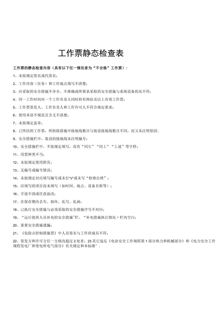 1、工作票静态检查表广源第三项目部龙溪电厂2020年工作票静态检查表工作票的静态检查内容(具有以下任一情况者为“不合格”工作票):1、未按规定签名或代签名;2、工作内容(任务)和工作地点填写不清楚;3、应采取的安全措施不齐全、不准确或所要求采取的安全措施与系统设备状况不符;4、同一工作时间内一个工作负责人同时持有两份及以上有效工作票;5、工作票签发人、工作负责人和工作许可人不符合规定要求;6、使用术语不规范且含义不清楚;7、未按规定盖章;8、已终结的工作票,所拆除措施中接地线数目与装设接地线数目不同,而又未注明原因;9、安全措施栏中,装设的接地线未注明编号;10、安全措施栏中,不按规定填写,而有“