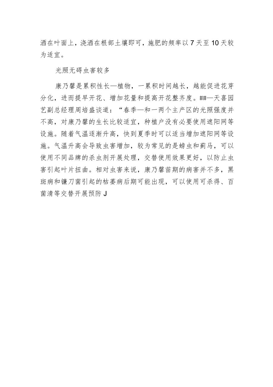 2、会吸收种苗中的水分,造成种苗枯死。栽培完成后,再开展一次浇水。这次浇水要浇透,春季的风很大,所以不用担心水浇多了。苗期施肥有侧重康乃馨喜欢保肥性好的土壤,并要求通气和排水性能好,最好富含腐殖质,掺有占土壤体积30%至40%的粗有机物,也可用泥炭混入珍珠岩。如果土壤有基肥,则可以在下种15天后施薄肥。若土壤没有基肥,施肥量要酌情增加。赵培飞说:“在小苗完全成活后,要开始施氮、磷、钾肥,这些元素是康乃馨生产期都需要的,但小苗生长期要多施氮肥。氮肥对小苗的叶片生长较为有利,后期可以增加磷肥和钾肥用量。”此外,施肥时尽量不要喷洒在叶面上,浇洒在根部土壤即可,施肥的频率以7天至10天较为适宜。光照无碍虫害较多康乃馨是累积性长植物,一累积时间越长,越能促进花芽分化,进而提早开花、增加花量和提高开花整齐度。#天喜园艺副总经理周培盛谈道:“春季和一两个主产区的光照强度并不高,对康乃馨的生长比较适宜,种植户没有必要使用遮阳网等设施。随着气温逐渐升高,快到夏季时可以适当增加遮阳网等设施。气温升高会导致虫害增加,较为常见的是螃虫和蓟马,可以使用不同品牌的杀虫剂开展处理,交替使用效果更好,以防止虫害引起叶片扭曲。相对虫害来说,康乃馨苗期的病害并不多,黑斑病和镰刀菌引起的枯萎病后期可能出现,可以使用可杀得、百菌清等交替开展预防J