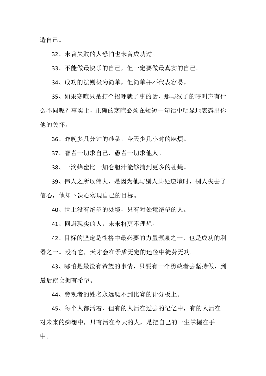 2、登它而不是仰望它的人来说才有真正意义。12、贫穷是不需要计划的,致富才需要一个周密的计划一一并去实践它。13、暗自伤心,不如立即行动。14、挫折时,要像大树一样,被砍了,还能再长;也要像杂草一样,虽让人践踏,但还能勇敢地活下去。15、随随便便浪费的时间,再也不能赢回来。16、只要有斗志,不怕没战场。17、最困难的时候,就是距离成功不远了。18、再多一点努力,就多一点成功。19、有压力,但不会被压垮;迷茫,但永不绝望。20、学会忘记,善忘是一件好事。21、要乐观,要积极,多笑,多照镜子22、相信他说的话,但不要当真。23、凡事多长心眼。24、世界会向那些有目标和远见的人让路。25、为了不让生活留