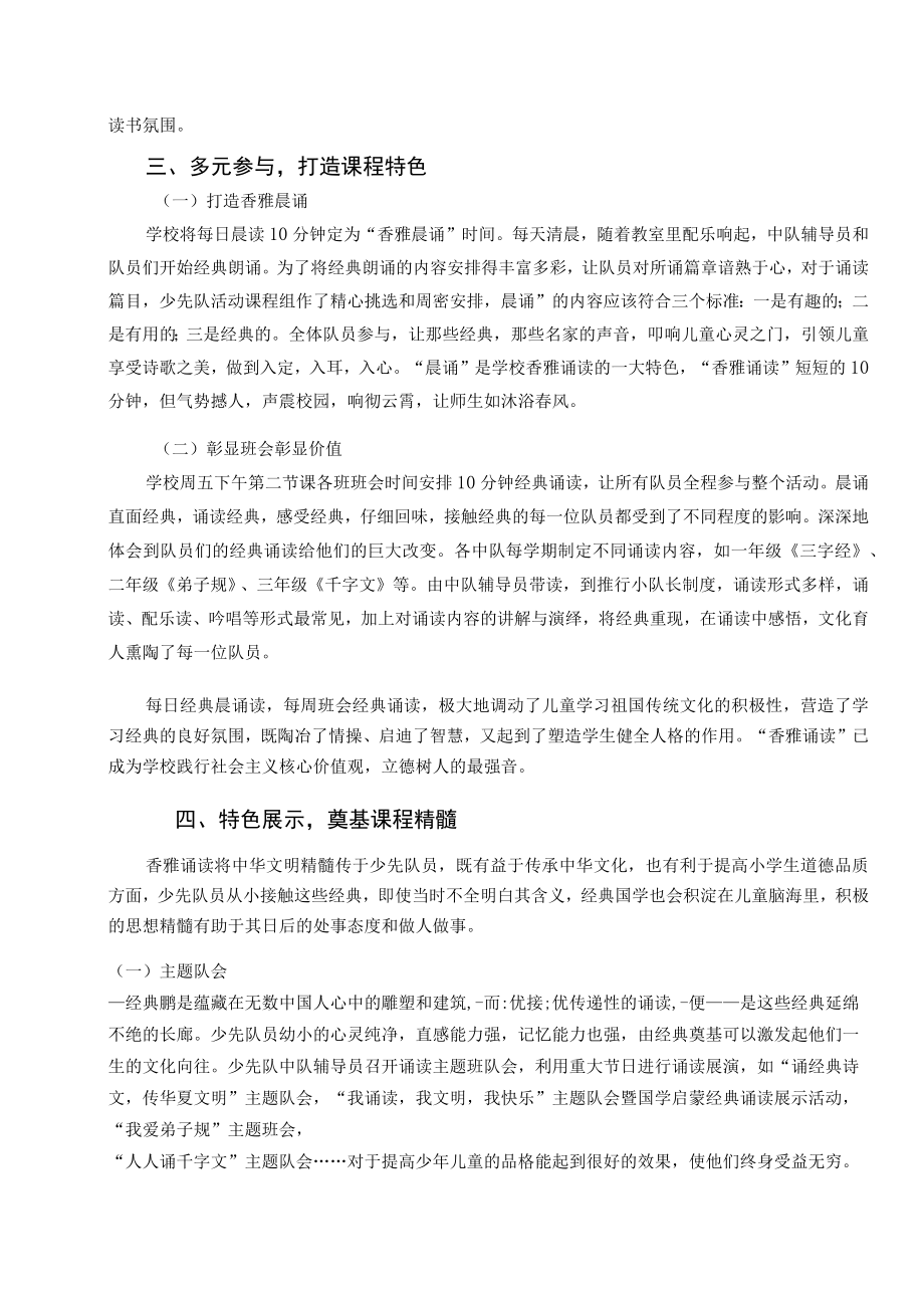 1、“香雅诵读”少先队活动课初探摘要:少先队活动课程贯穿于学校教育教学的全过程和学生日常生活的各个方面,是校园实施素质教育的重要组成部分。中华经典诗文承载着中华民族精神和传统文化教育的精华,内容博大精深,是建设社会主义先进文化的宝贵资源。少先队活动课开展经典诵读活动,面向少年儿童,中队辅导员充分发挥少先队在立德树人中的重要作用,培养德智体美劳全面发展的社会主义建设者和接班人。坚持课堂内外的队课、仪式教育、实践活动、协同教育等多种形式结合,通过因地制宜的校园文化特色教育,培养新时代少先队员“理想信念、道德品行、精神品质”等核心素养为目标,提升少年儿童思想文化修养,建立文化自信,从道德养成对少年儿童开