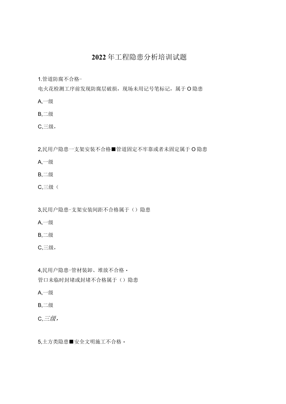 1、2022年工程隐患分析培训试题1.管道防腐不合格-电火花检测工序前发现防腐层破损,现场未用记号笔标记,属于O隐患A,一级B,二级C,三级,2,民用户隐患一支架安装不合格管道固定不牢靠或者未固定属于O隐患A,一级B,二级C,三级(3,民用户隐患-支架安装间距不合格属于()隐患A,一级B,二级C,三级,4,民用户隐患-管材装卸、堆放不合格管口未临时封堵或封堵不合格属于()隐患A,一级B,二级C,三级,5,土方类隐患安全文明施工不合格行车道路边开挖管沟,路边未拉安全警示带属于O隐患A,一级(上确答案)B,二级C,三级6,管道、设备吊装不合格(如直接使用铁链吊装管道)属于O隐患A,一级B,二级C,三级