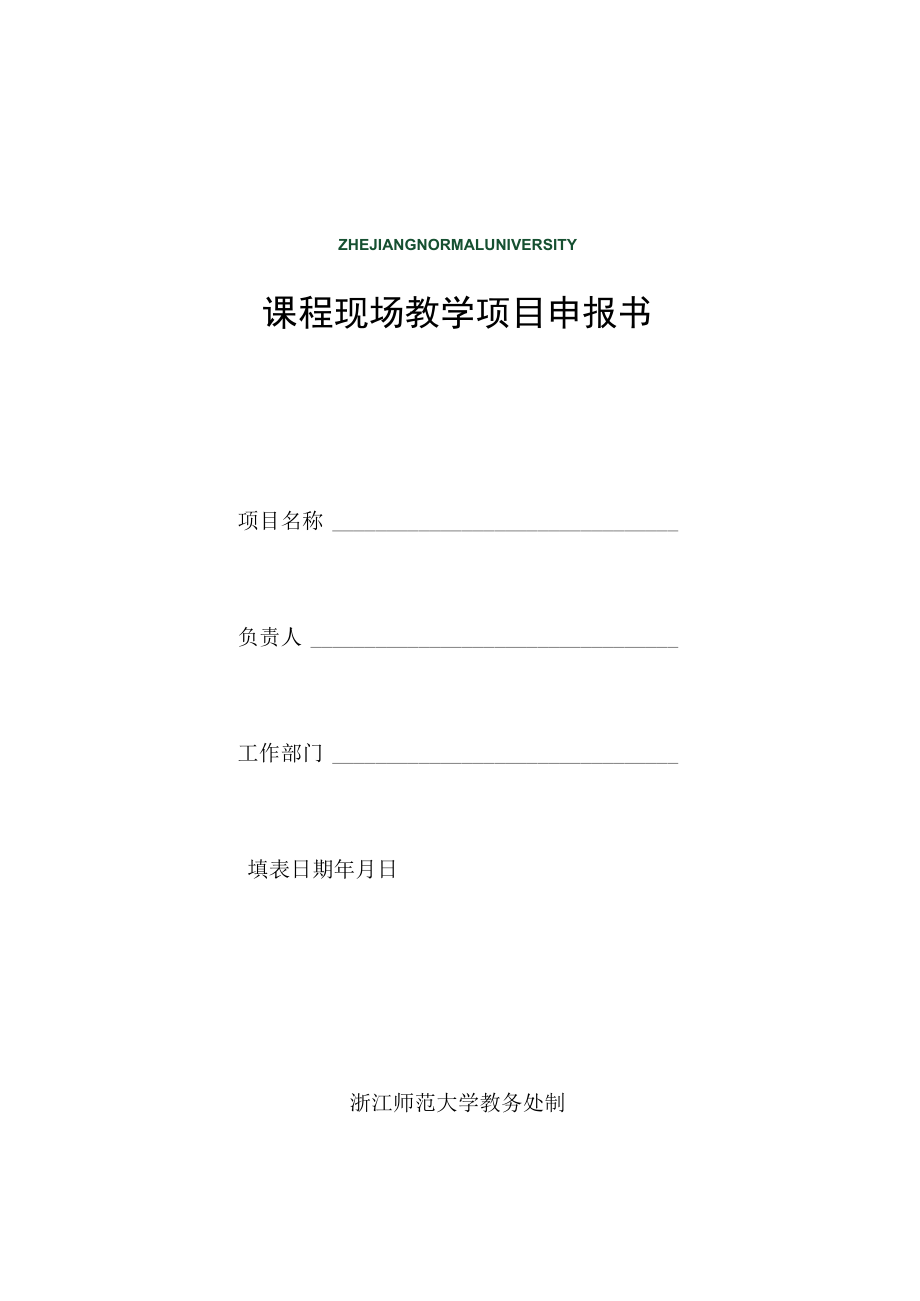 ZHEJIANGNORMALUNIVERSITY课程现场教学项目申报书项目名称负责人工作部门填表日期年月日浙江师范大学教务处制项目名称项目类别(见立项内容)项目依托课程负责人职称/学位工作部门联系电话电子邮箱参与或受益学生人数近两年主要教学课程申请经费(元)预期成果形式团队成员姓名职称/学位工作部门承担的主要任务适用学生信息专业年级人数一、项目立项依据、内容、实施方案及预期成果等(一)立项依据(二)项目内容()项目实施方案、进度安排(须明确现场教学课的大致时间、主要内容)(四)预期成果(五)学生受益状况二、项目负责人的主要教学、科研成果及获奖情况(含指导学生获奖)三、项目经费预算预算支出科目金额(元)支出根据及理由总计四、审查意见(一)学院评审专家组意见专家签名:年月日(二)学院审查意见签章:年月0(三)学校意见签章:年月B